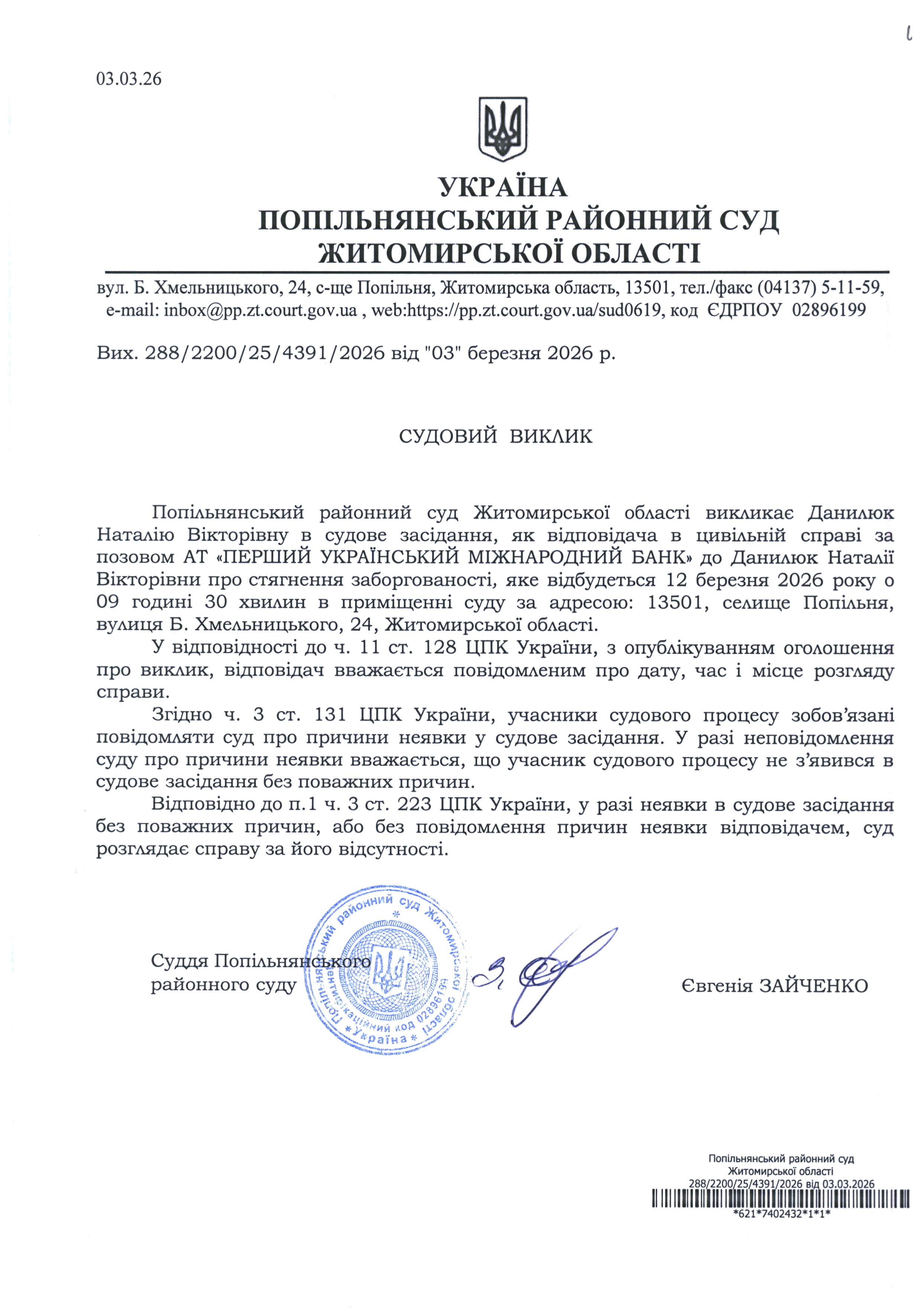 Оголошення про виклик до суду Данилюк Наталію Вікторівну