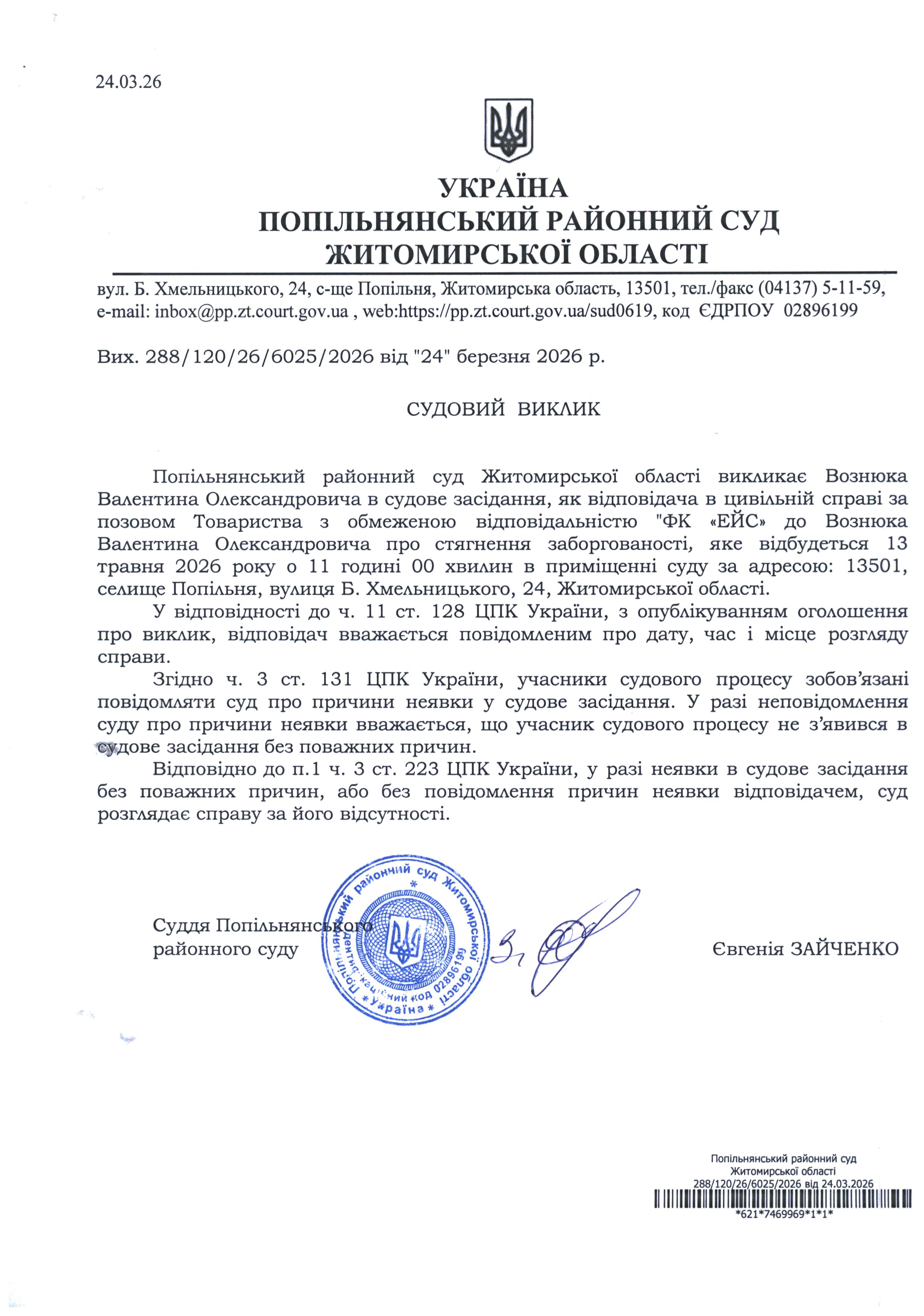 Оголошення про виклик до суду Вознюка Валентина Олександровича