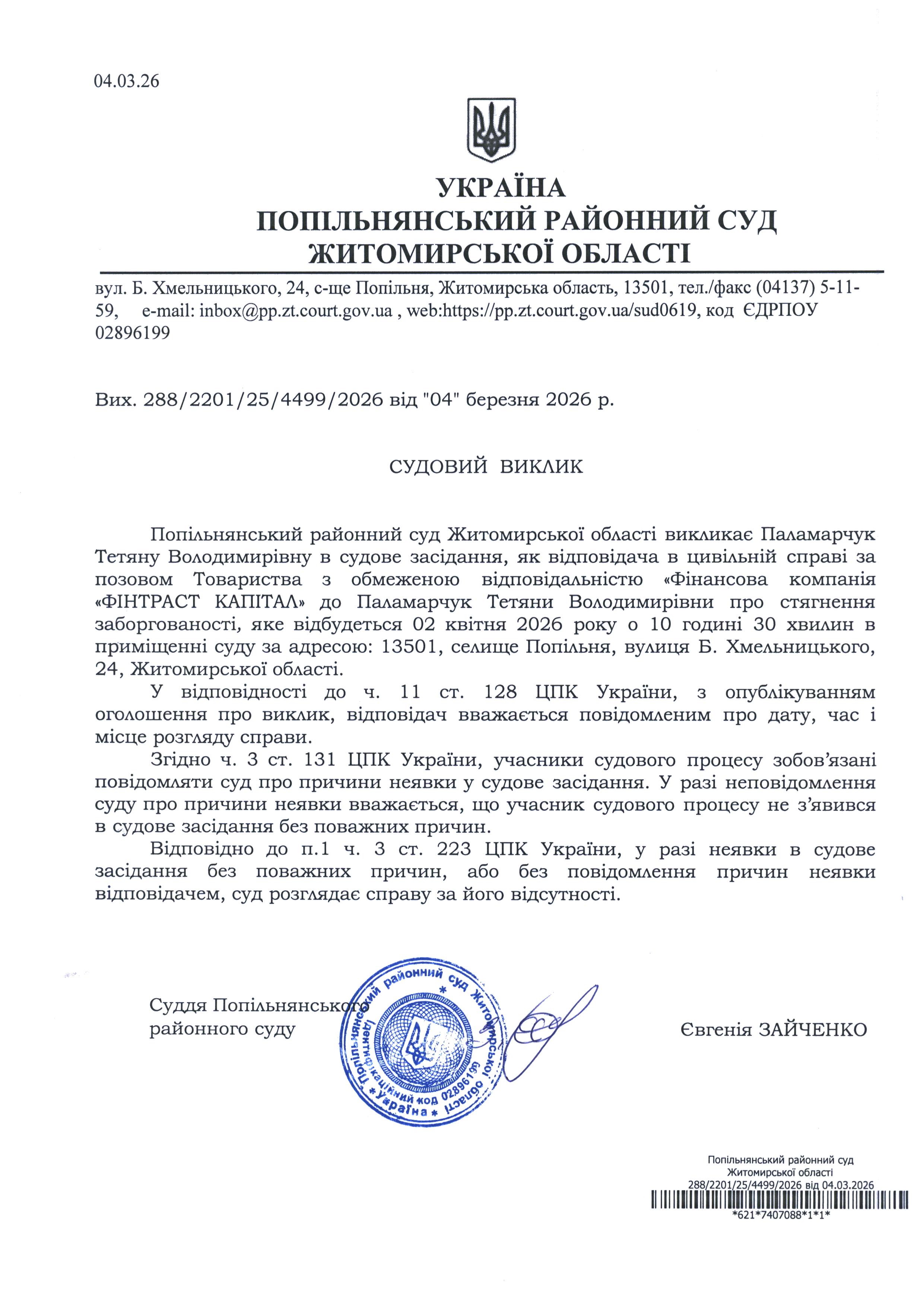 Оголошення про виклик до суду Паламарчук Тетяну Володимирівну