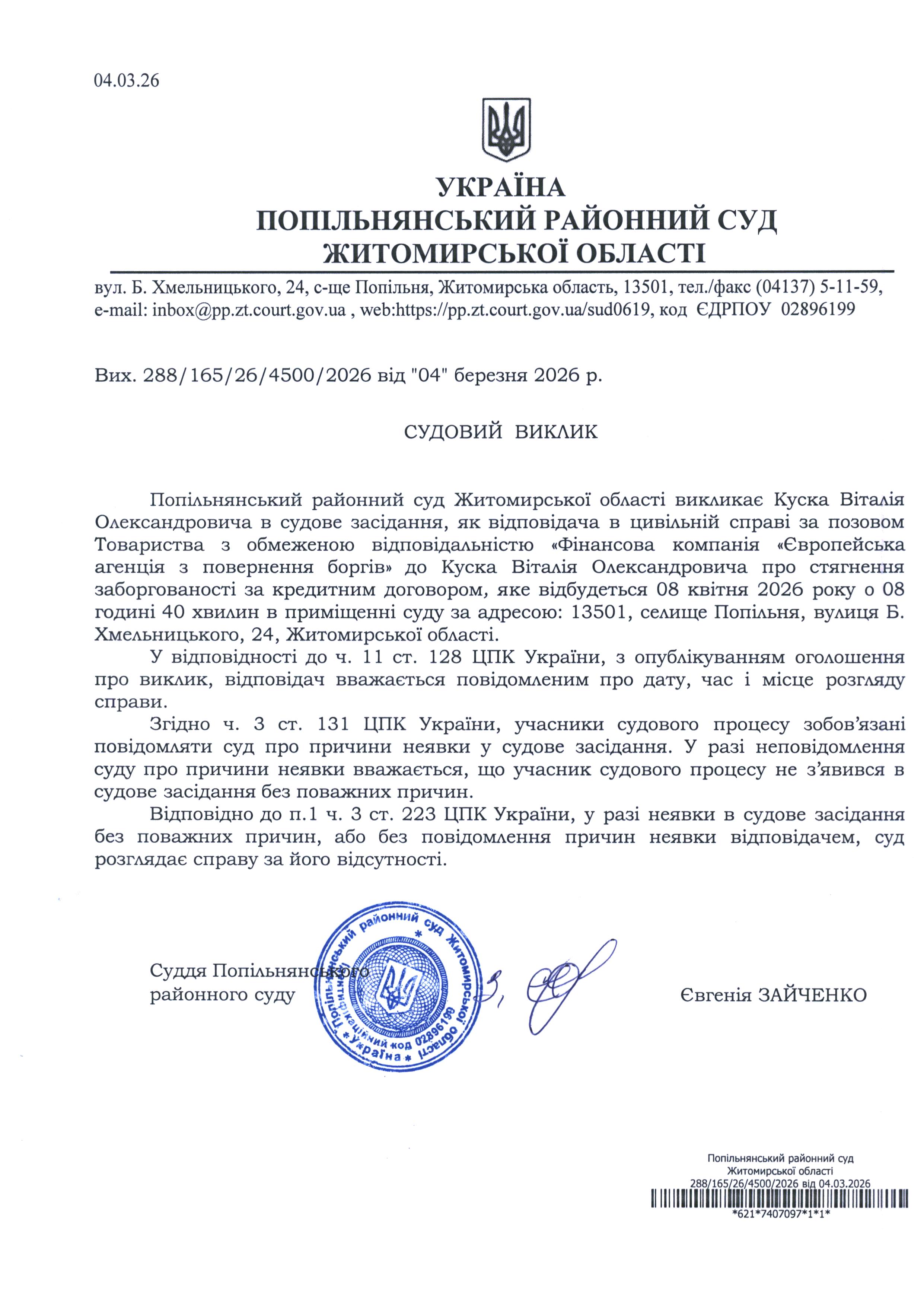Оголошення про виклик до суду Куска Віталія Олександровича