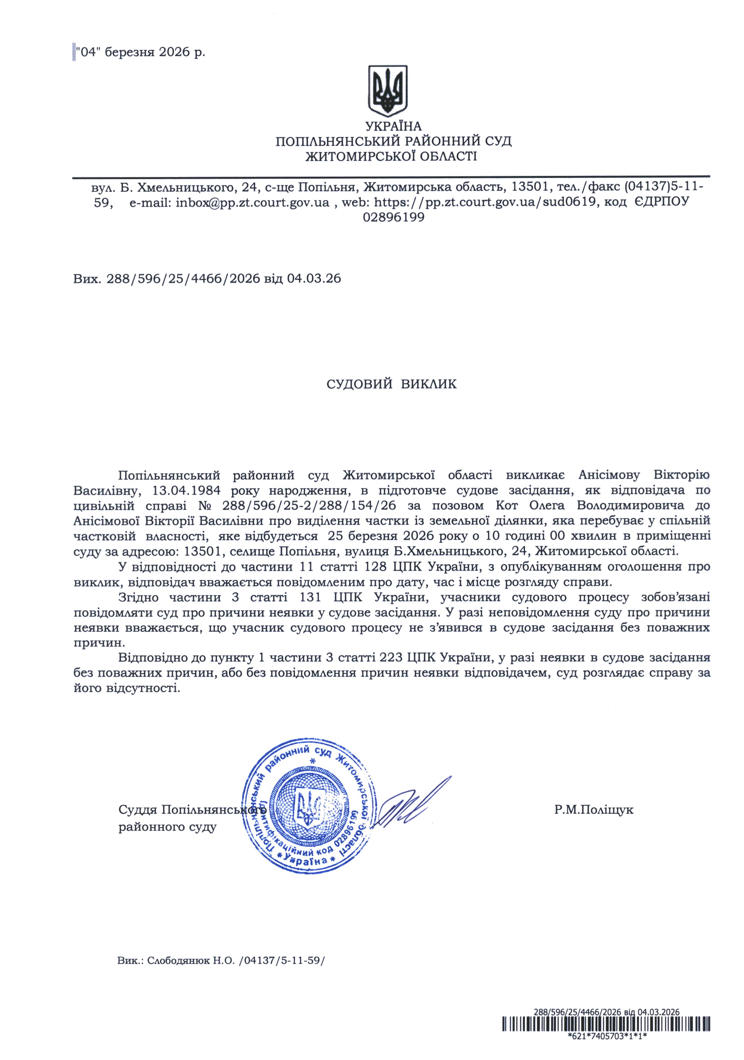 Оголошення про виклик до суду Анісімову Вікторію Василівну