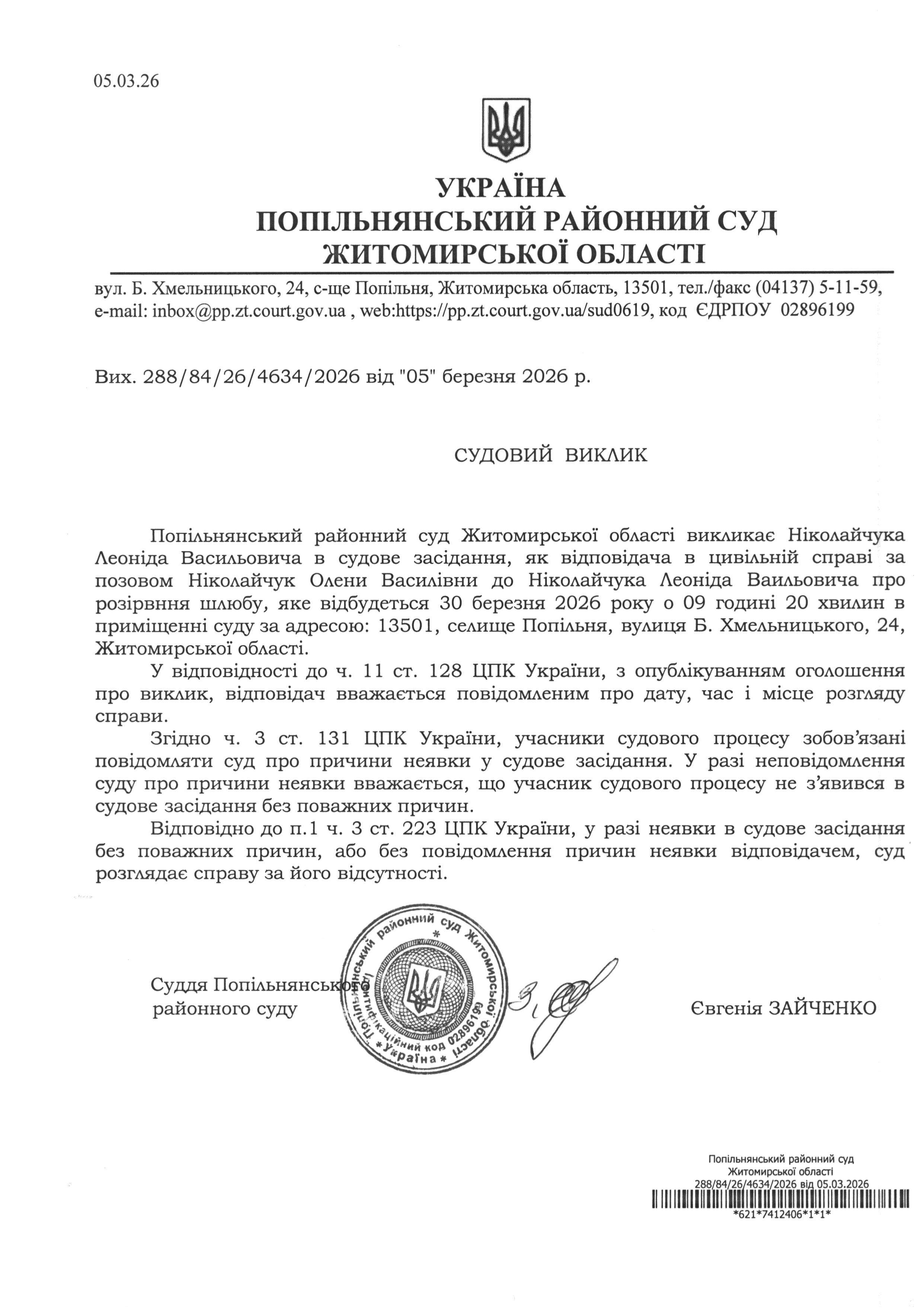 Оголошення про виклик до суду Ніколайчука Леоніда Васильовича