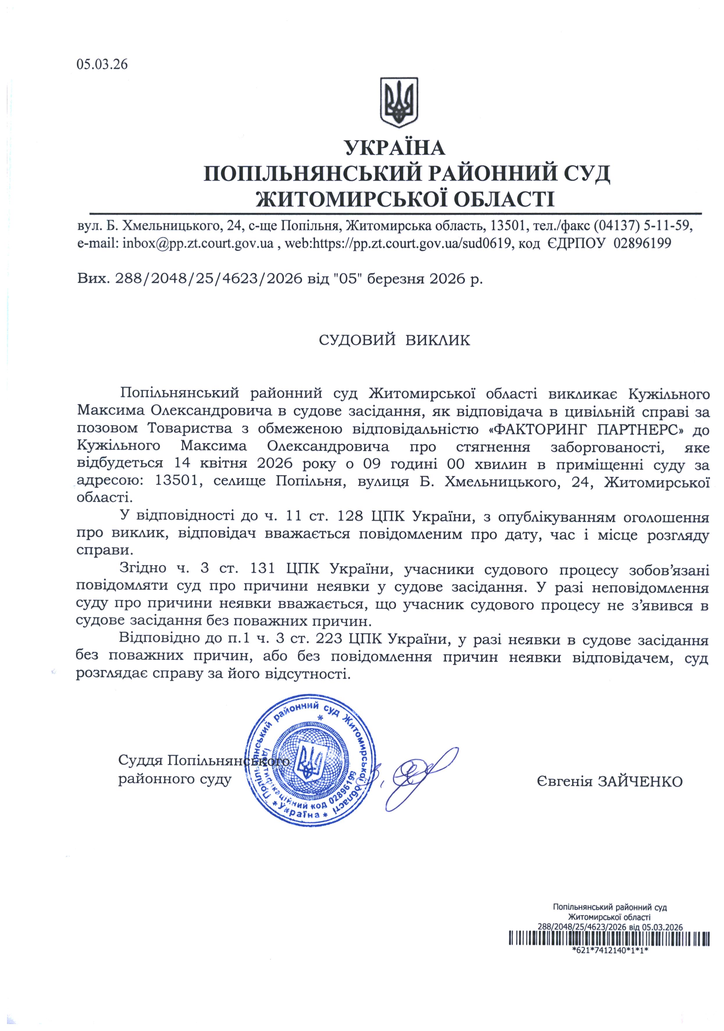Оголошення про виклик до суду Кужільного Максима Олександровича