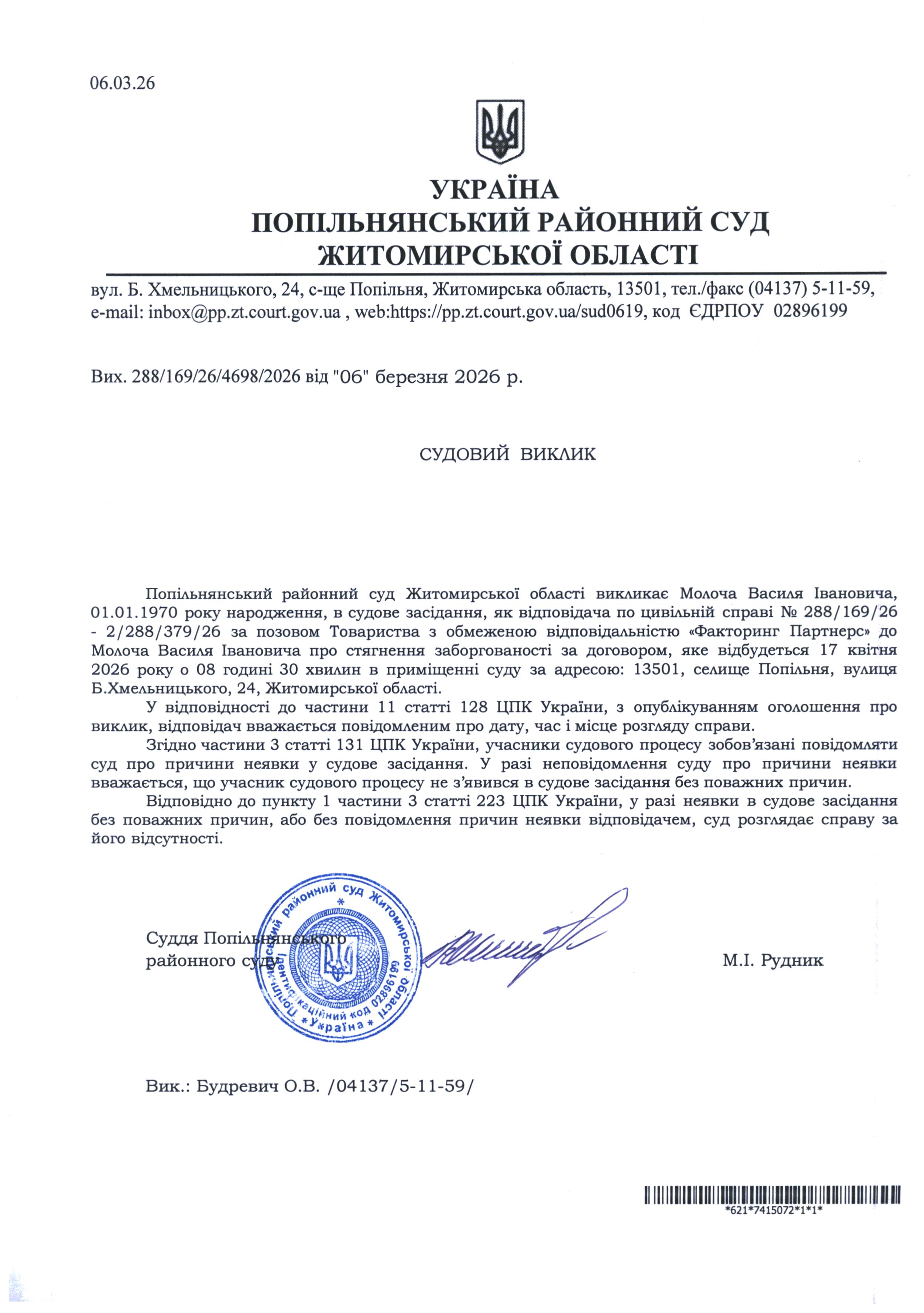 Оголошення про виклик до суду Молоча Василя Івановича