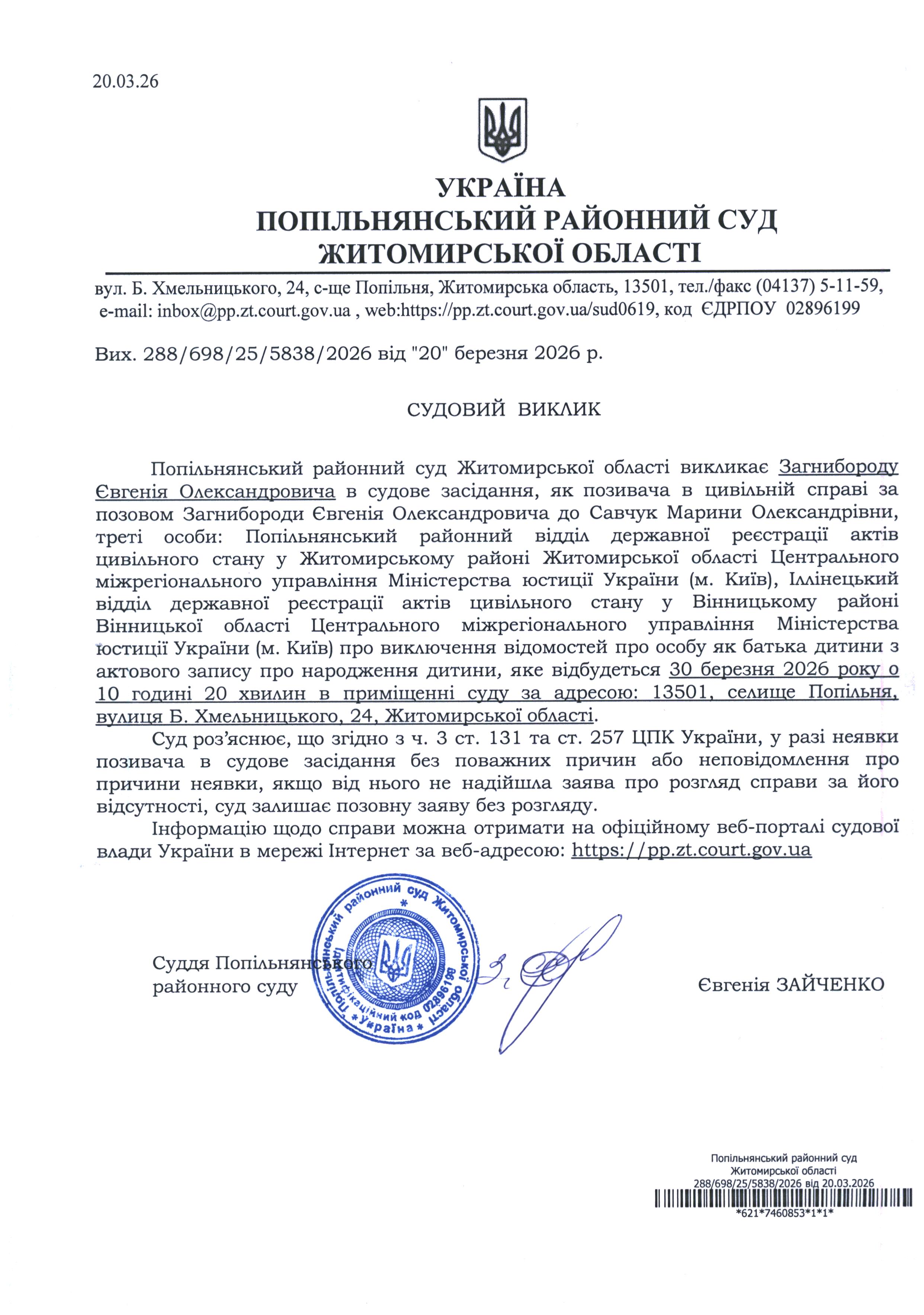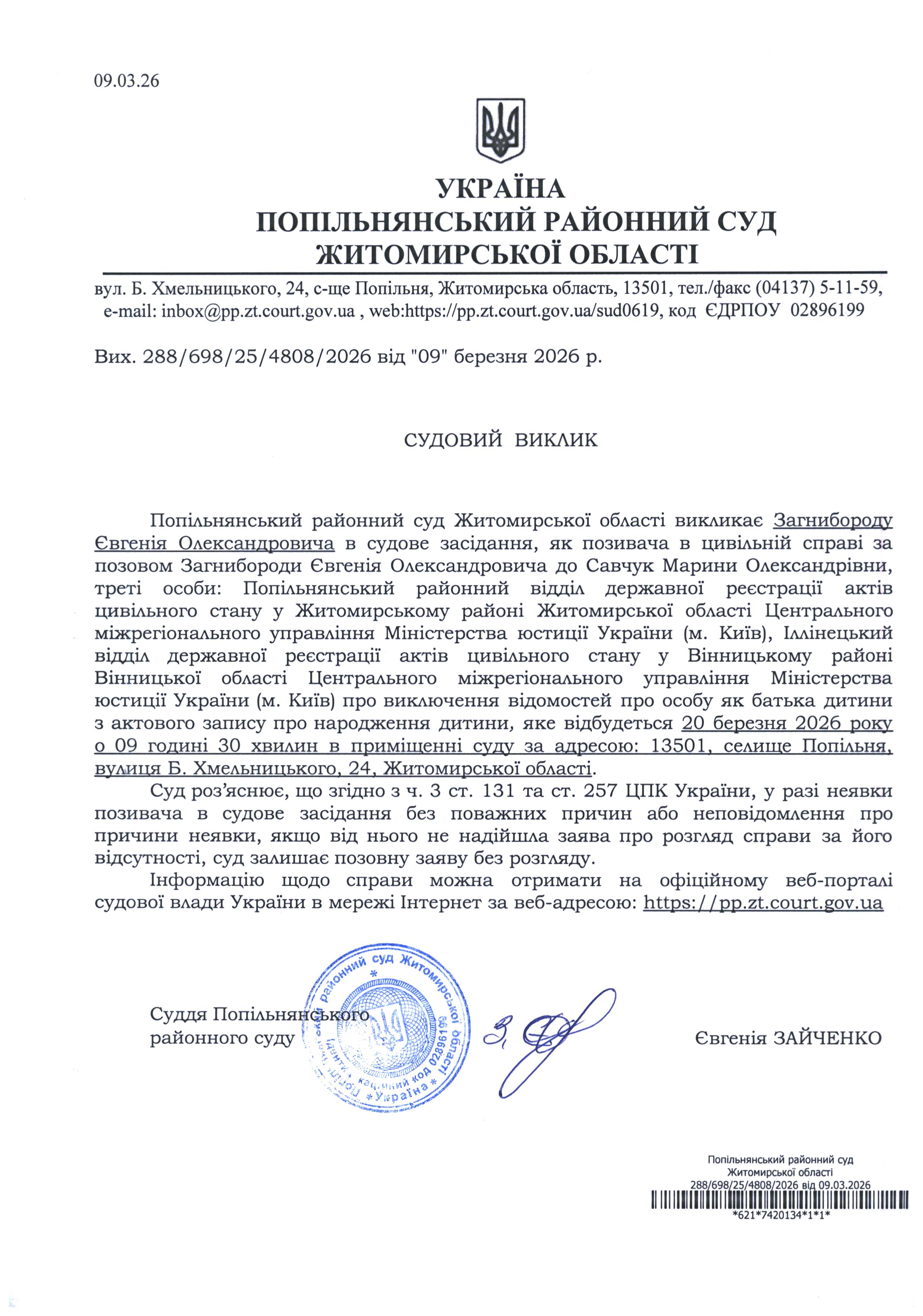 Оголошення про виклик до суду Загнибороду Євгенія Олександровича
