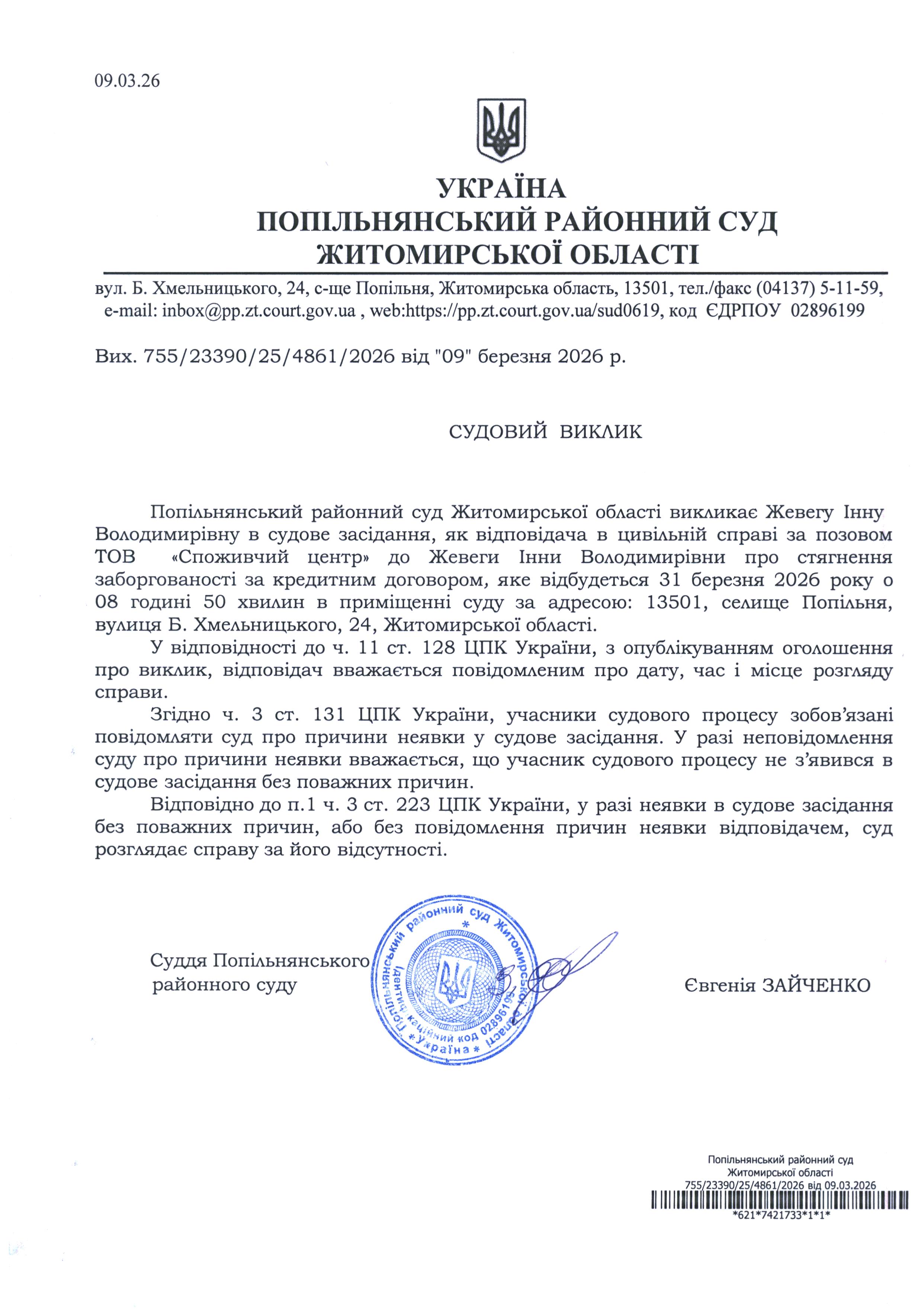 Оголошення про виклик до суду Жевегу Інну Володимирівну