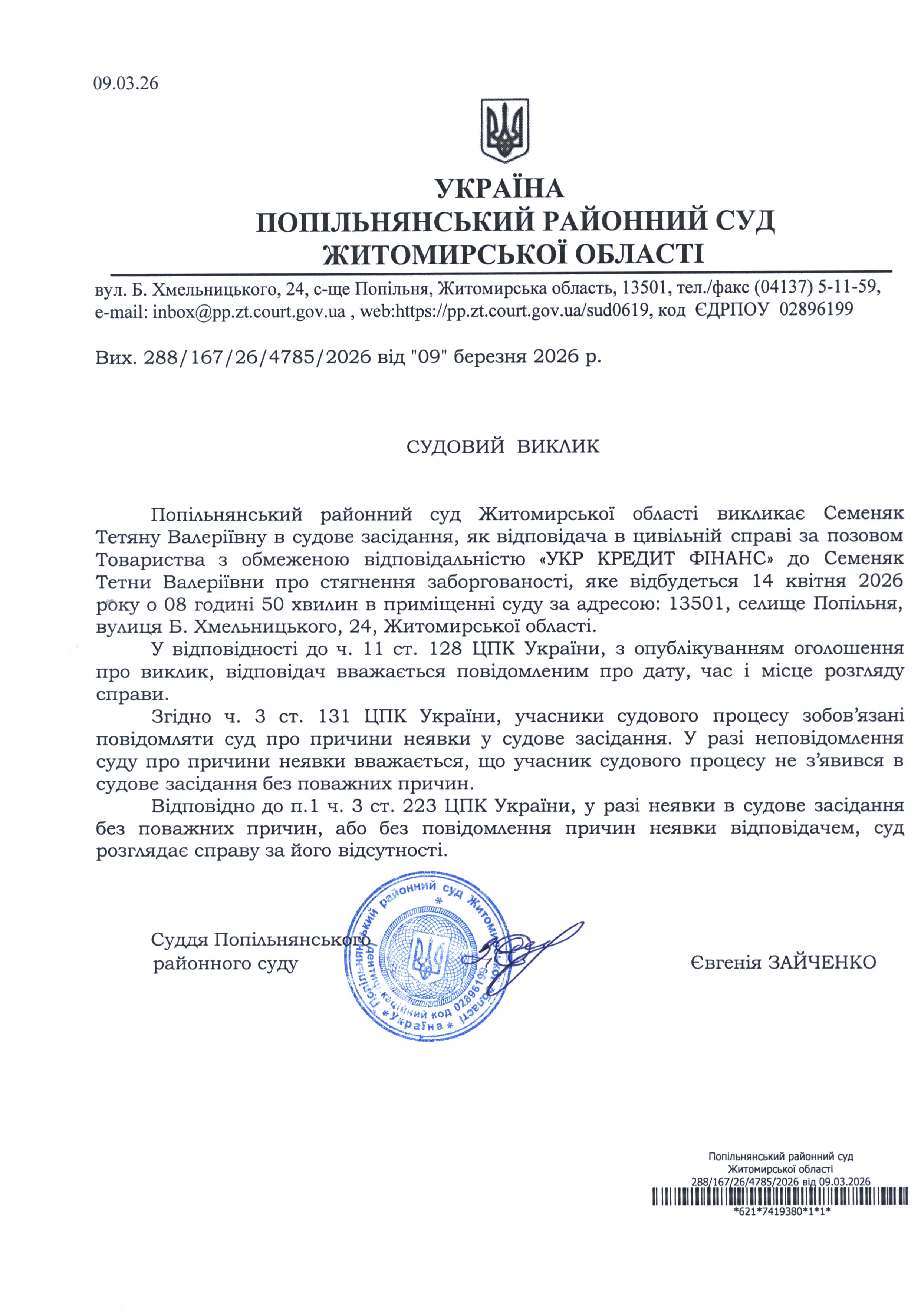Оголошення про виклик до суду Семеняк Тетяну Валеріївну