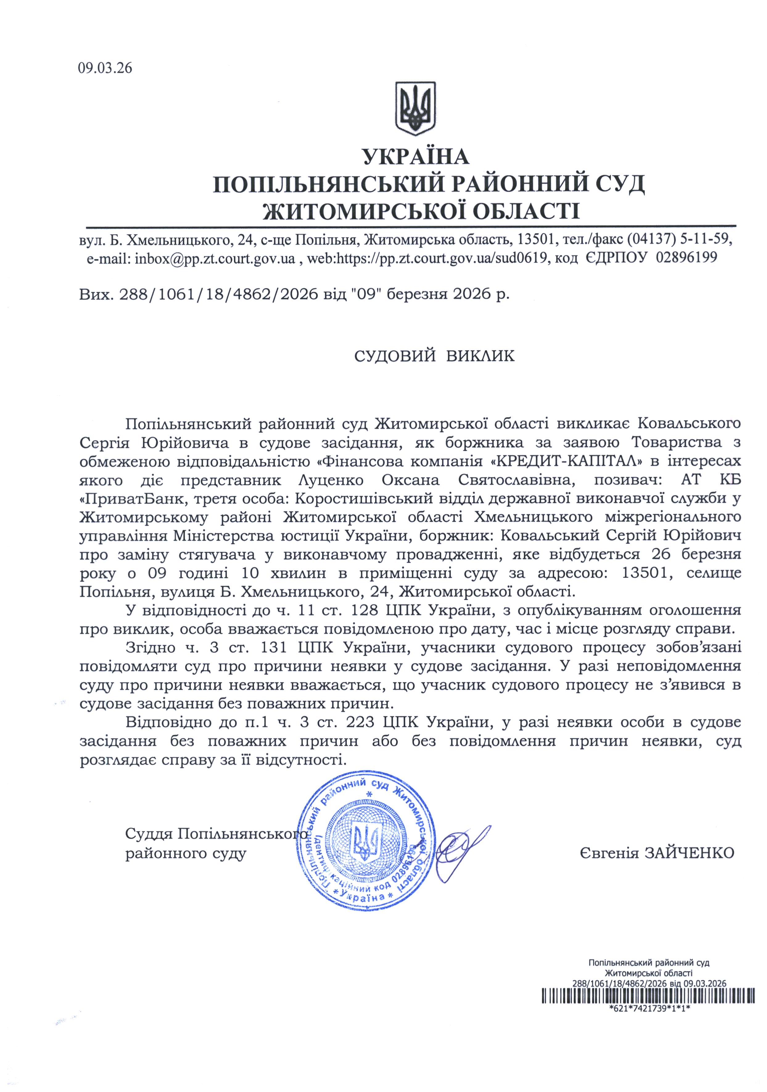 Оголошення про виклик до суду Ковальського Сергія Юрійовича