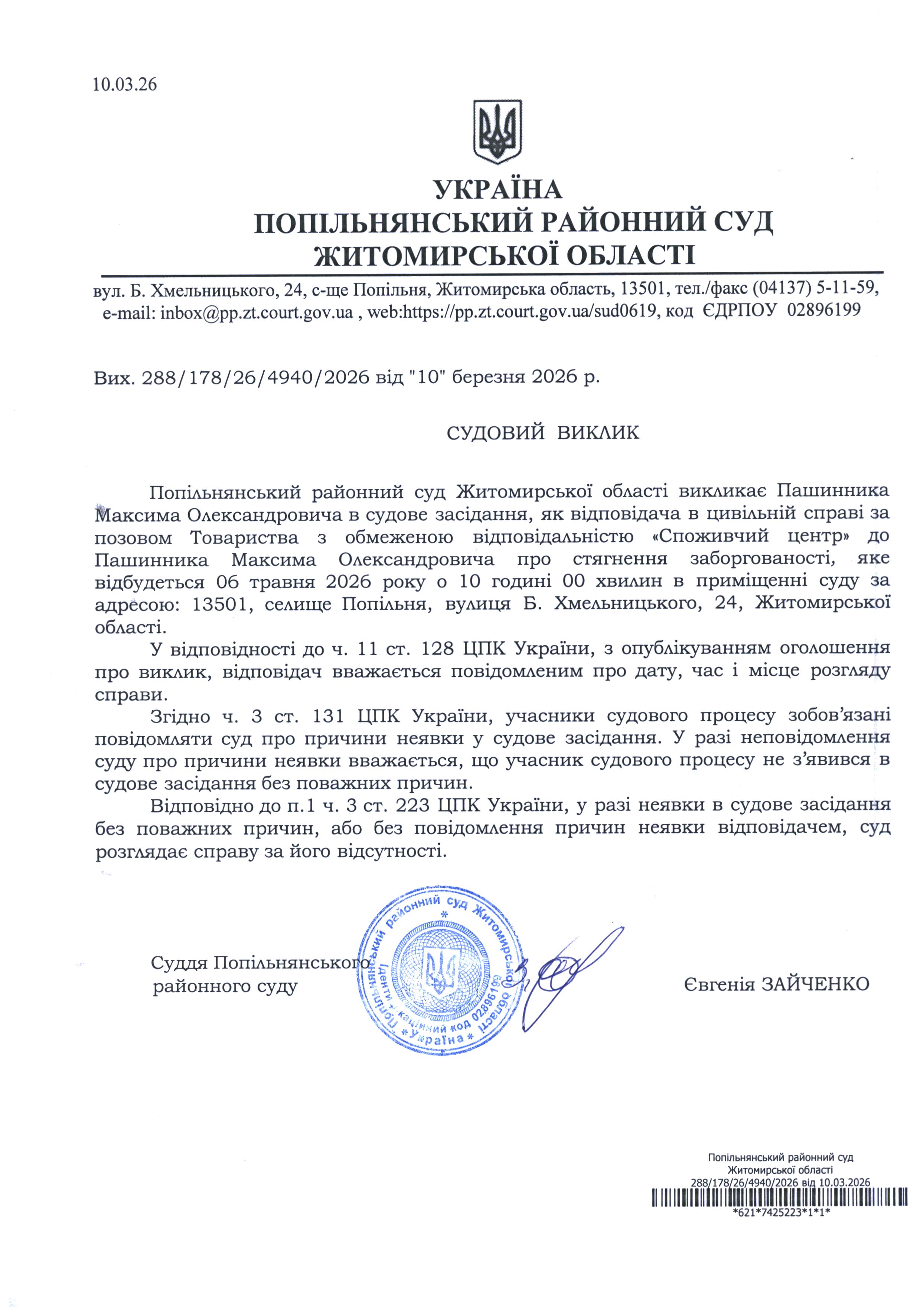Оголошення про виклик до суду Пашинника Максима Олександровича