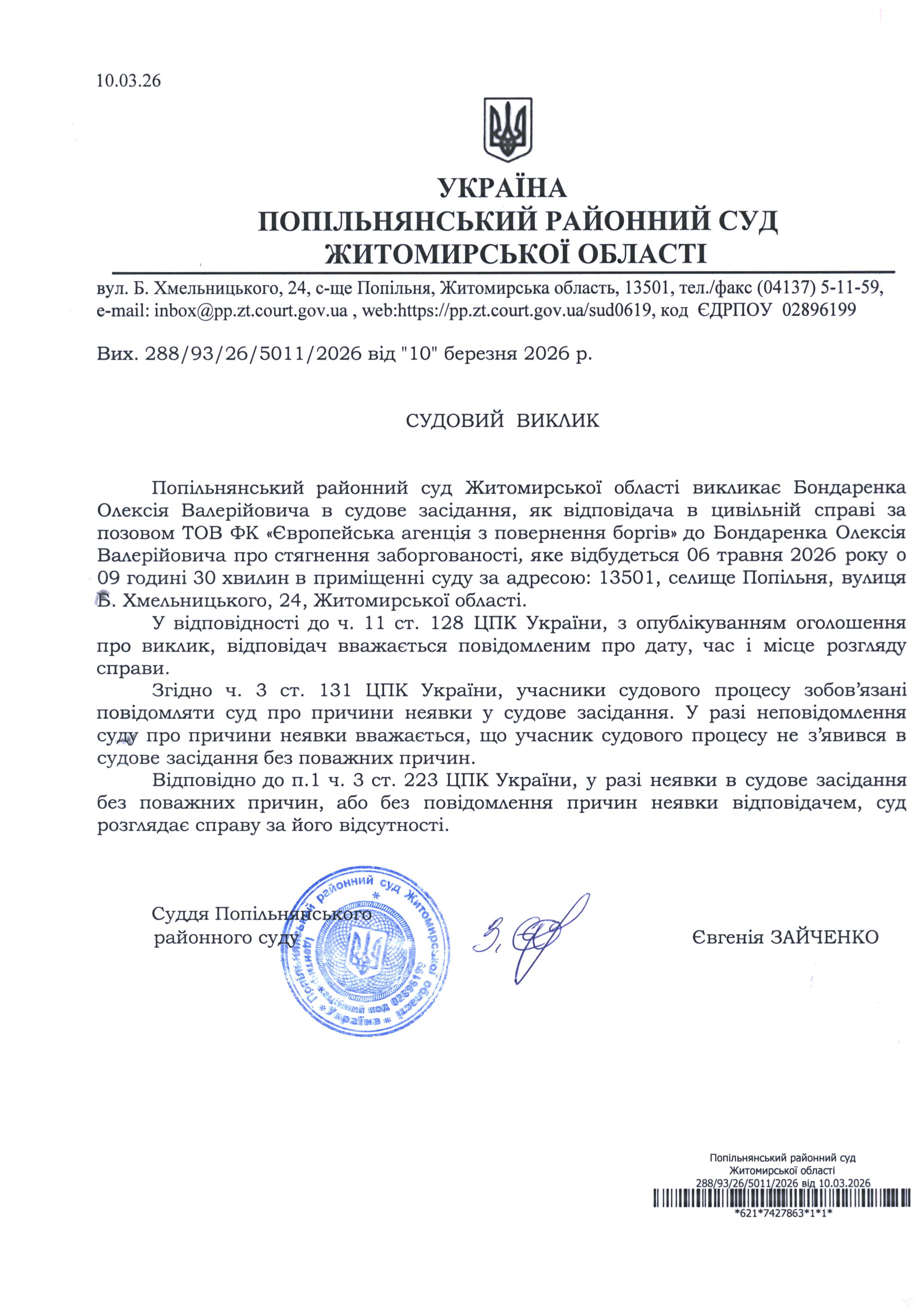 Оголошення про виклик до суду Бондаренка Олексія Валерійовича