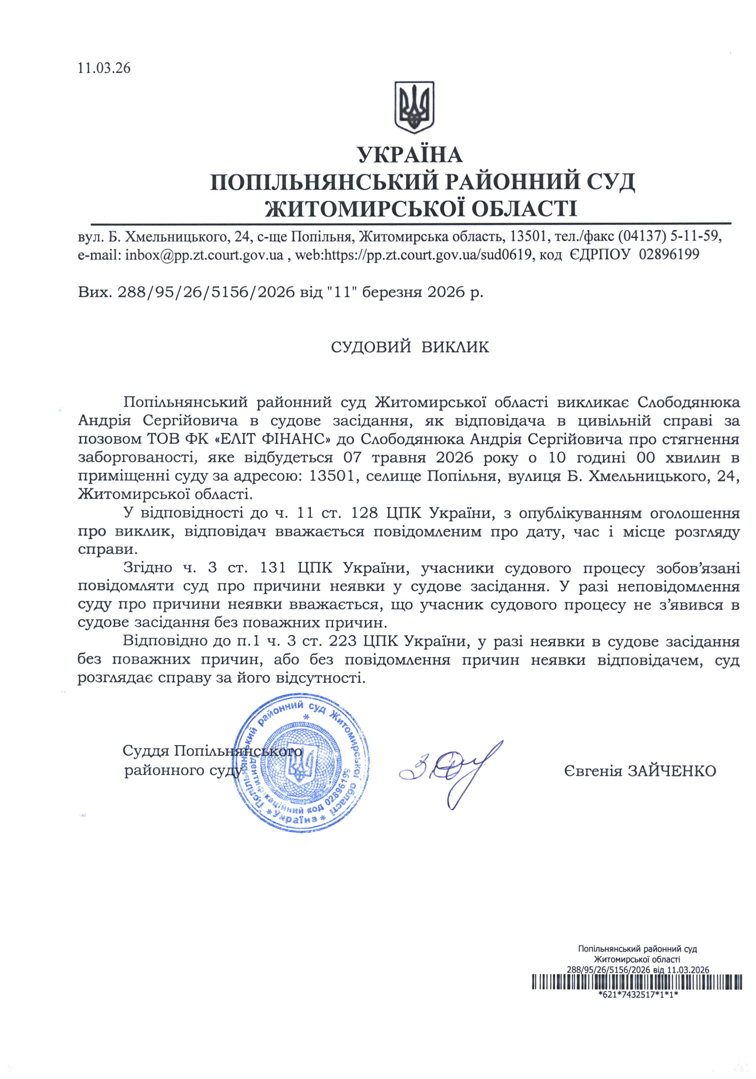 Оголошення про виклик до суду Слободянюка Андрія Сергійовича