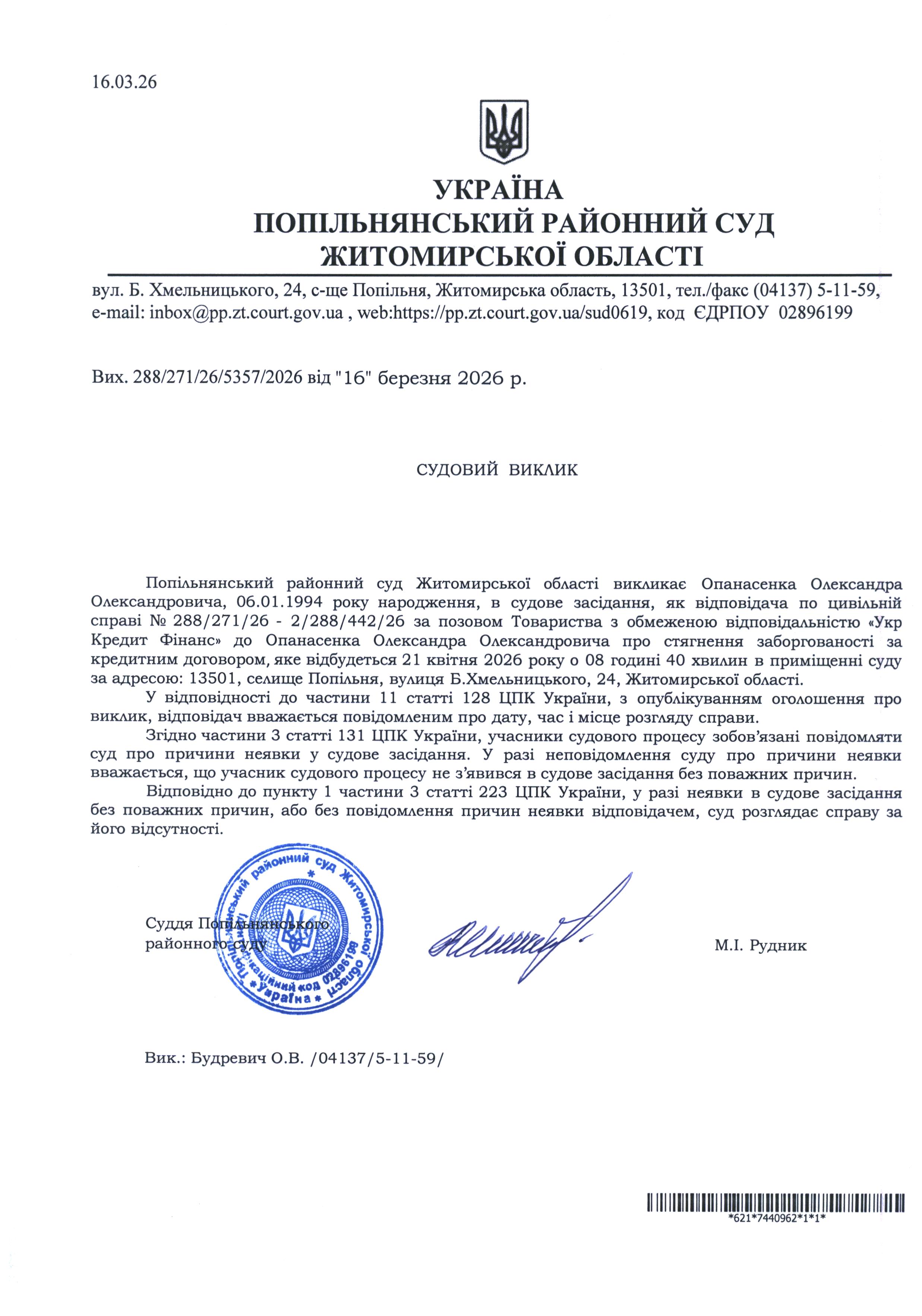 Оголошення про виклик до суду Опанасенка Олександра Олександровича