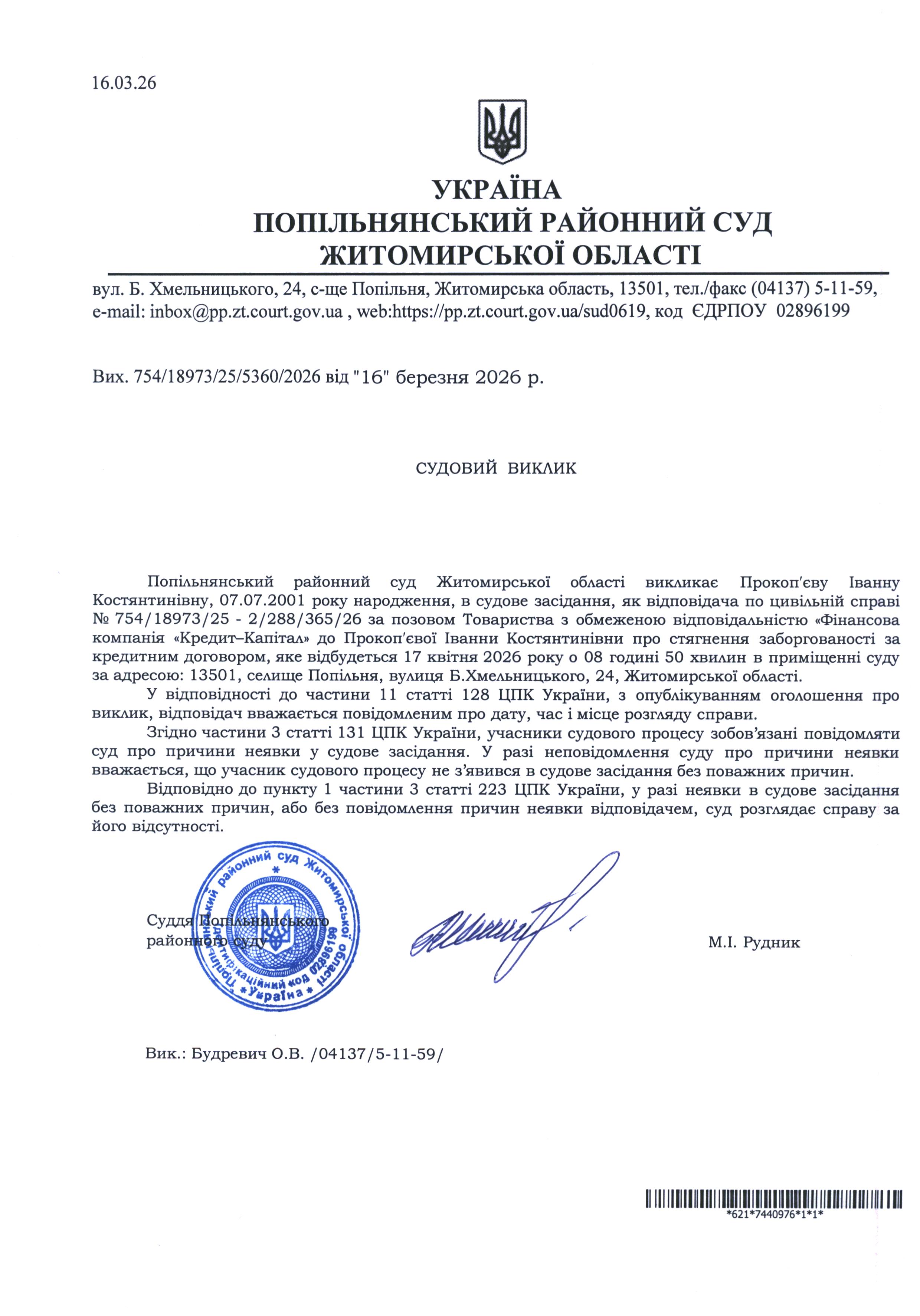 Оголошення про виклик до суду Прокоп'єву Іванну Костянтинівну