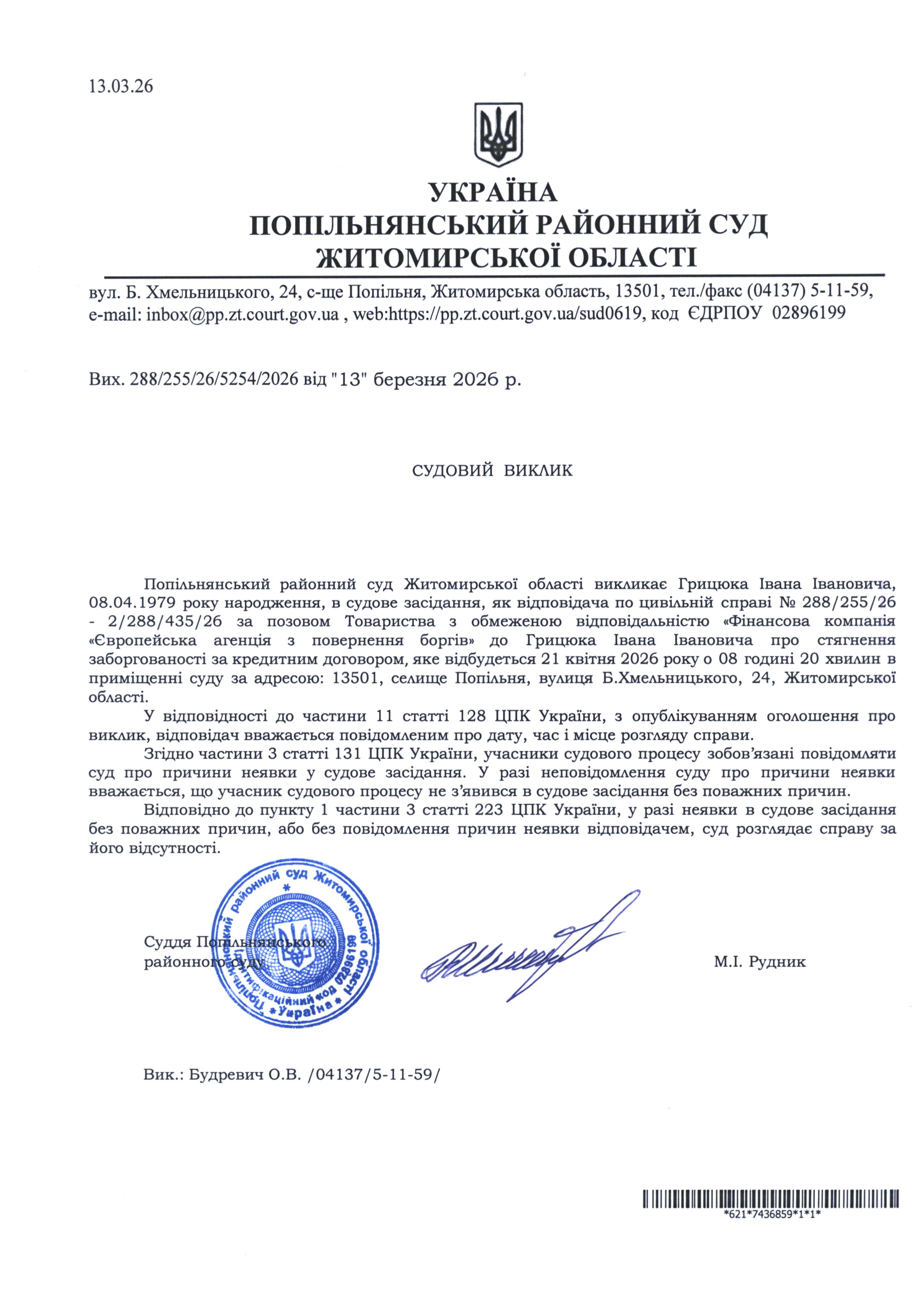 Оголошення про виклик до суду Грицюка Івана Івановича