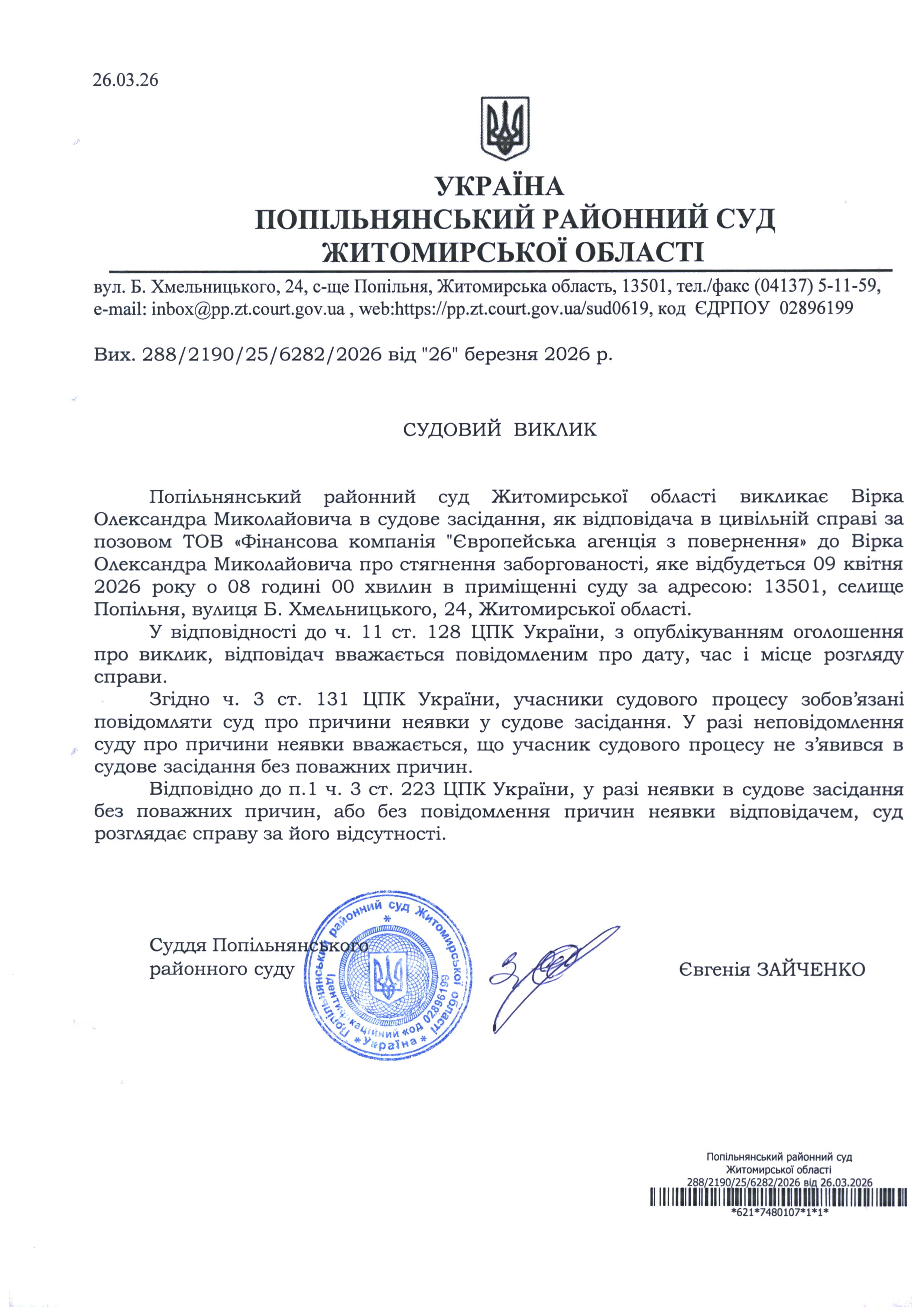 Оголошення про виклик до суду Вірка Олександра Миколайовича