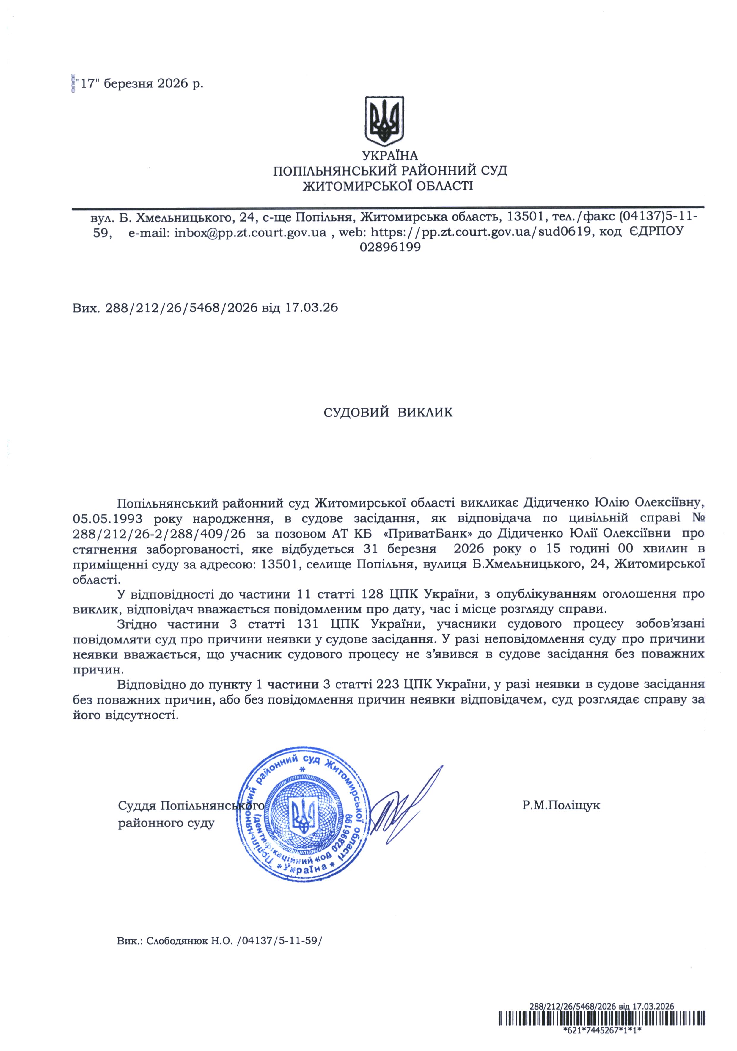 Оголошення про виклик до суду Дідиченко Юлію Олексіївну