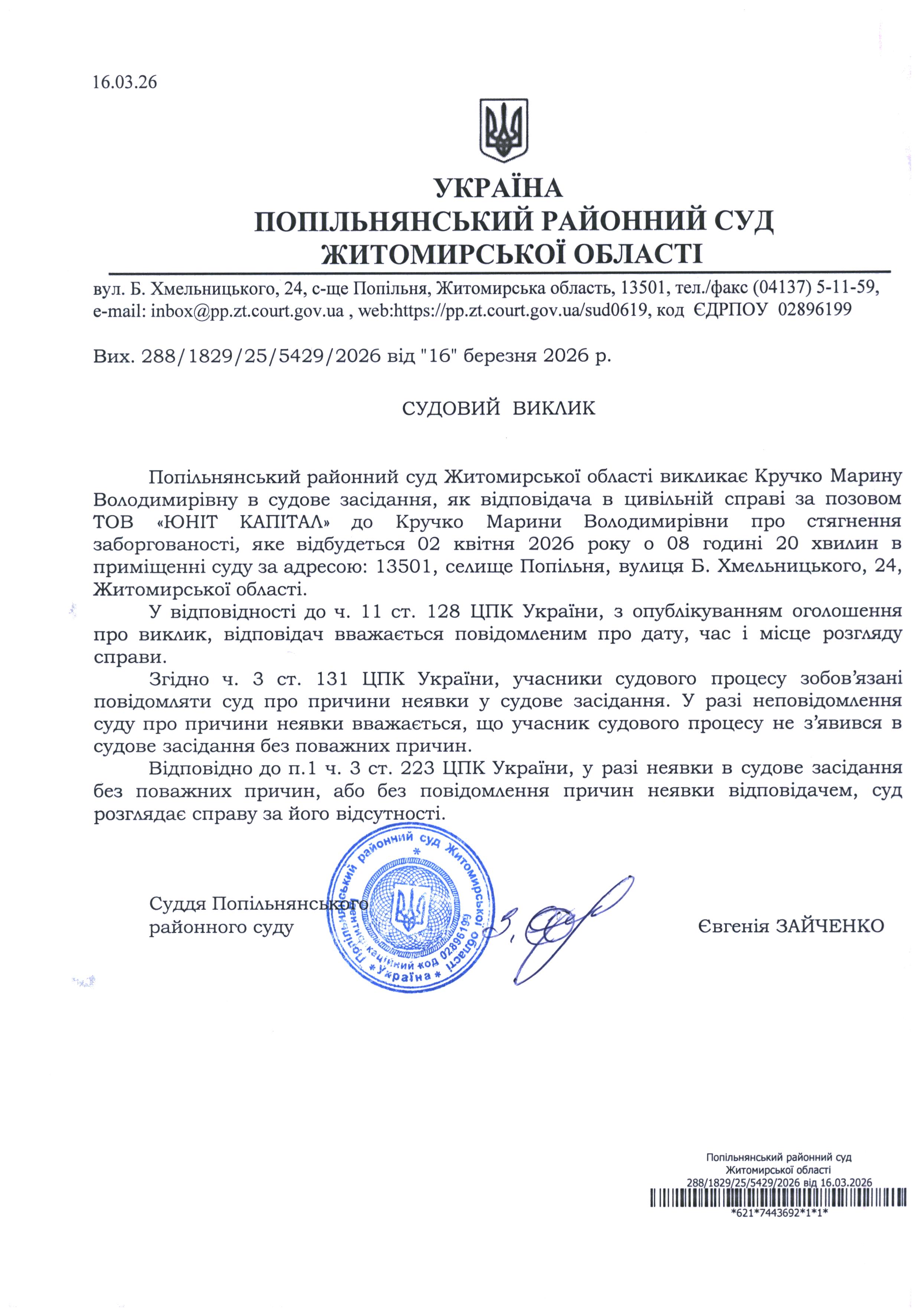 Оголошення про виклик до суду Кручко Марину Володимирівну