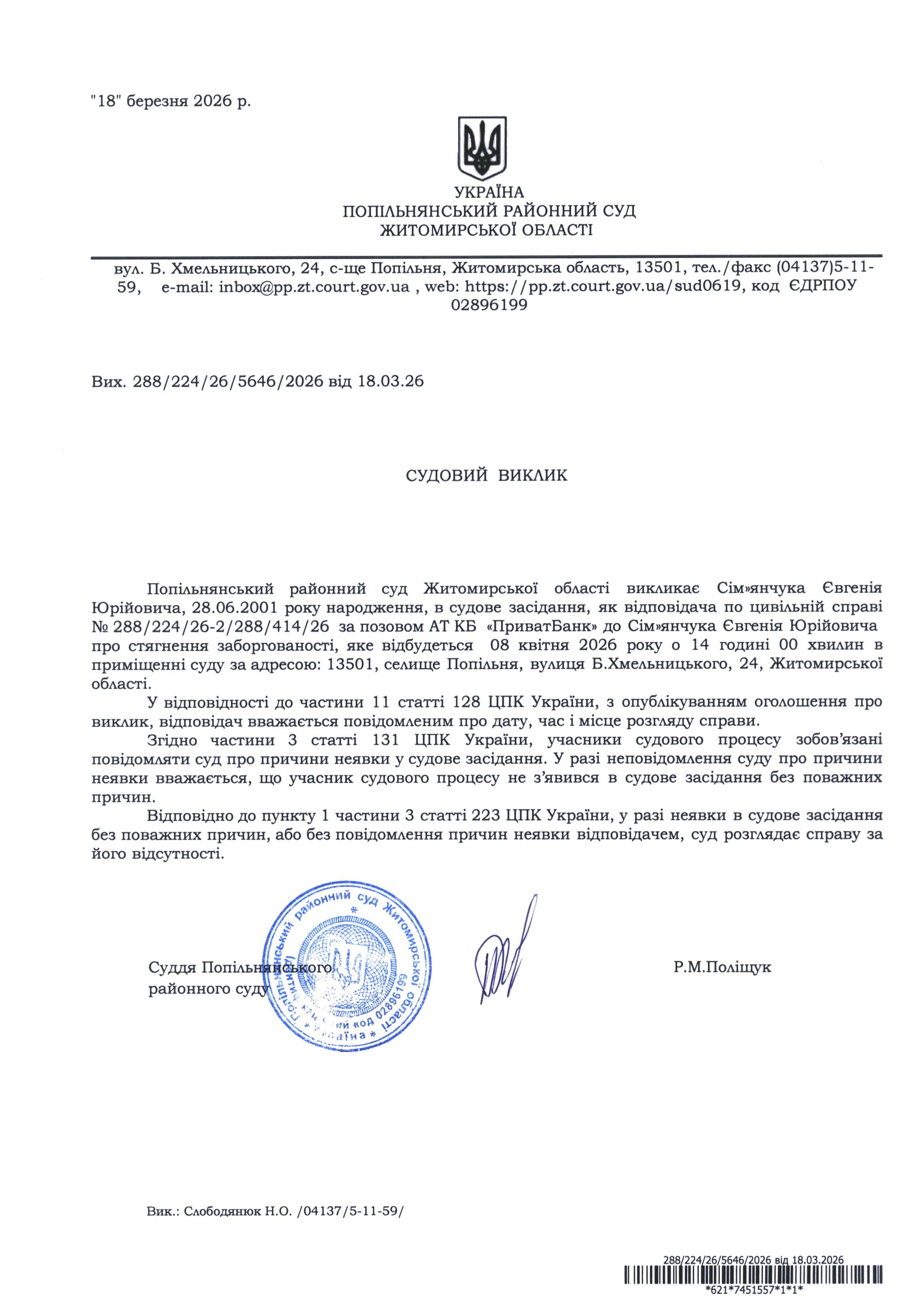 Оголошення про виклик до суду Сім'янчука Євгенія Юрійовича
