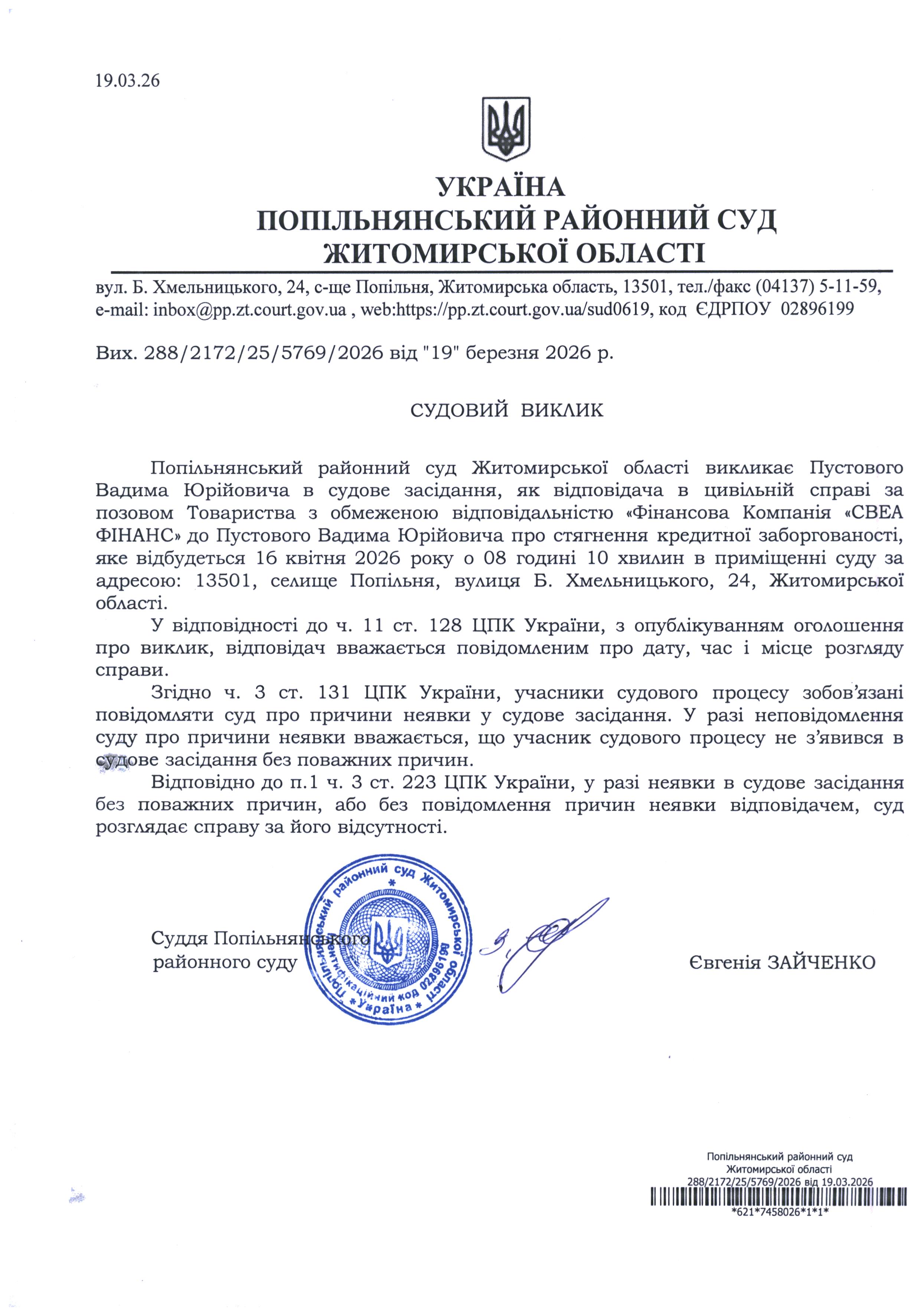 Оголошення про виклик до суду Пустового Вадима Юрійовича