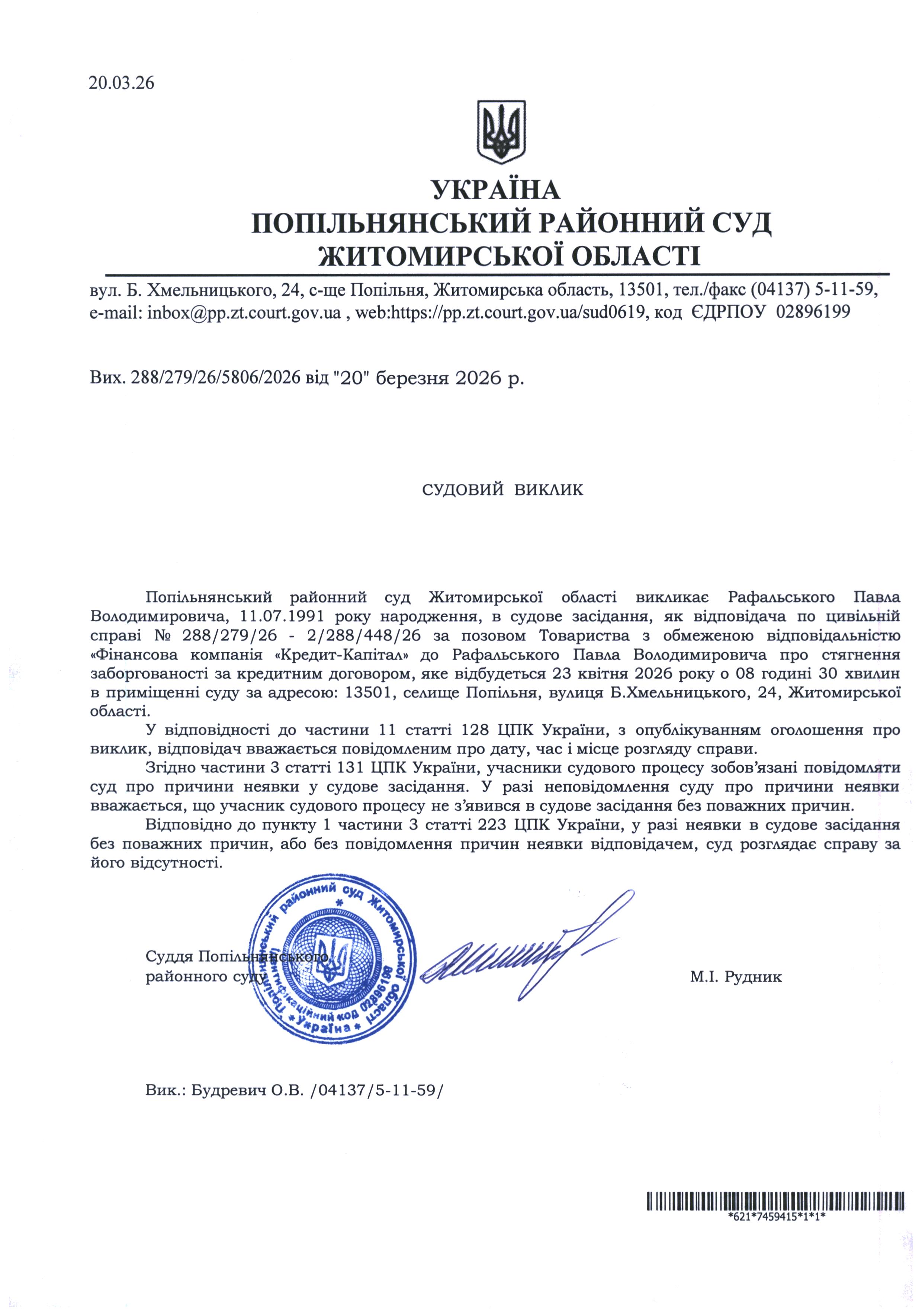 Оголошення про виклик до суду Рафальського Павла Володимировича