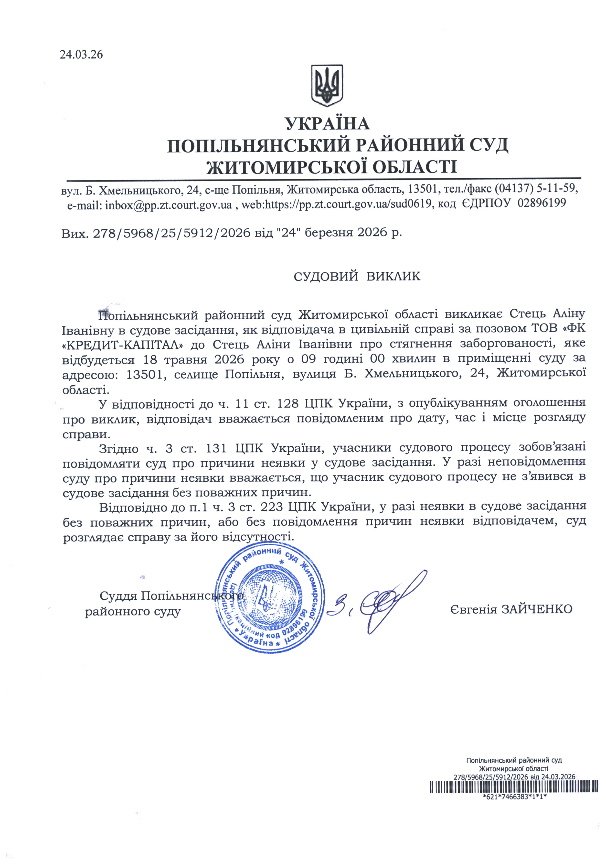Оголошення про виклик до суду Стець Аліну Іванівну