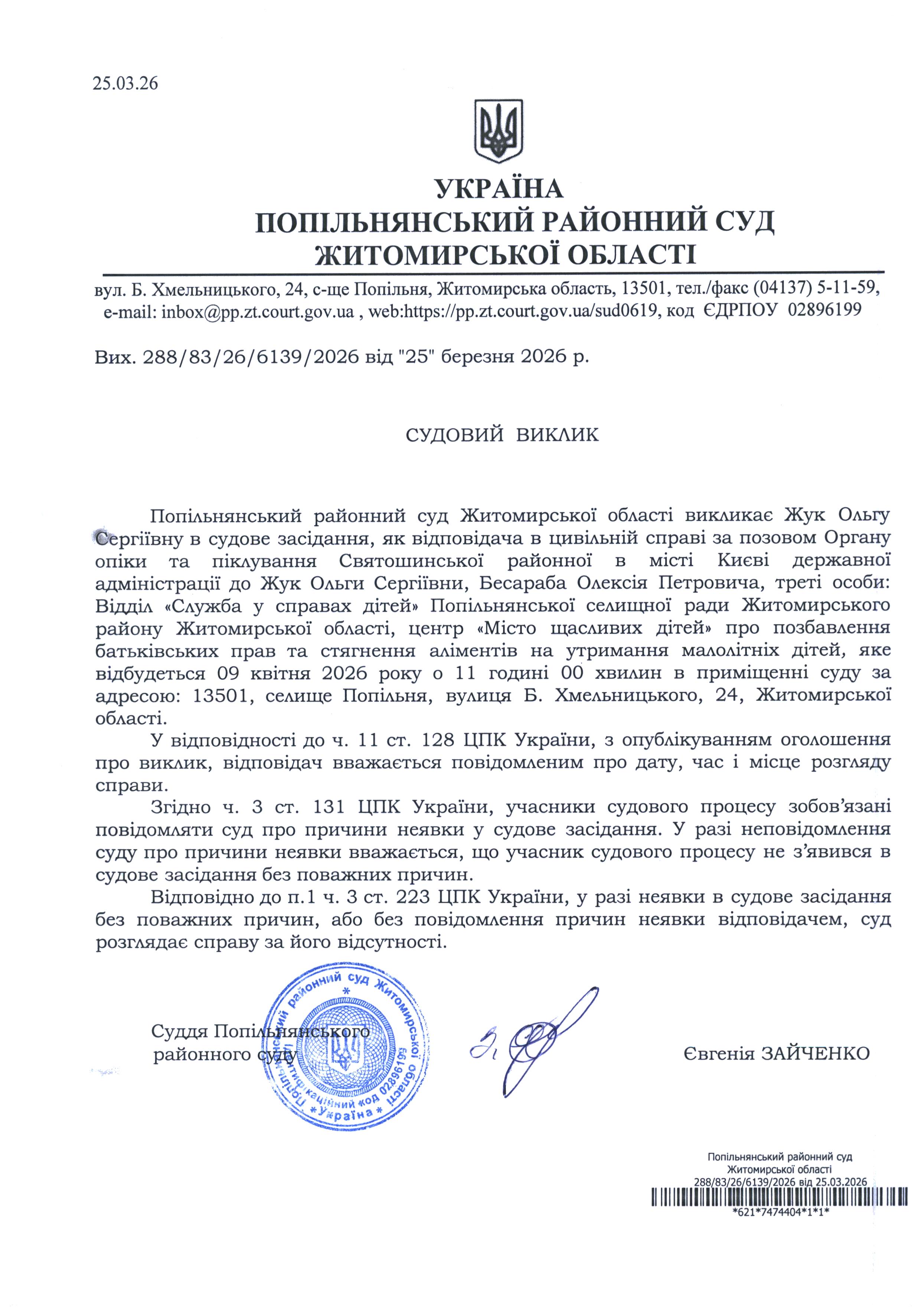 Оголошення про виклик до суду Жук Ольгу Сергіївну
