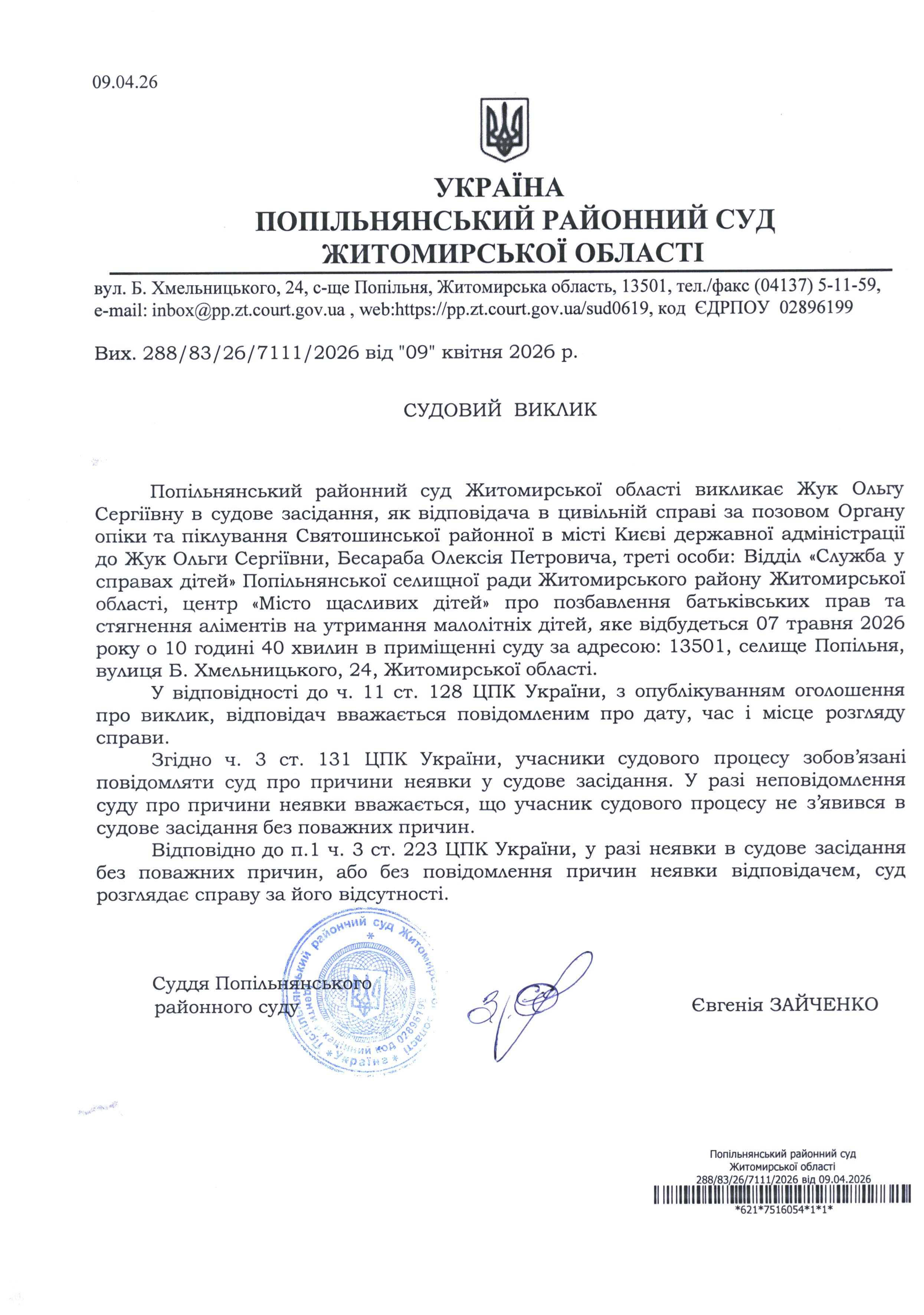 Оголошення про виклик до суду Жук Ольгу Сергіївну