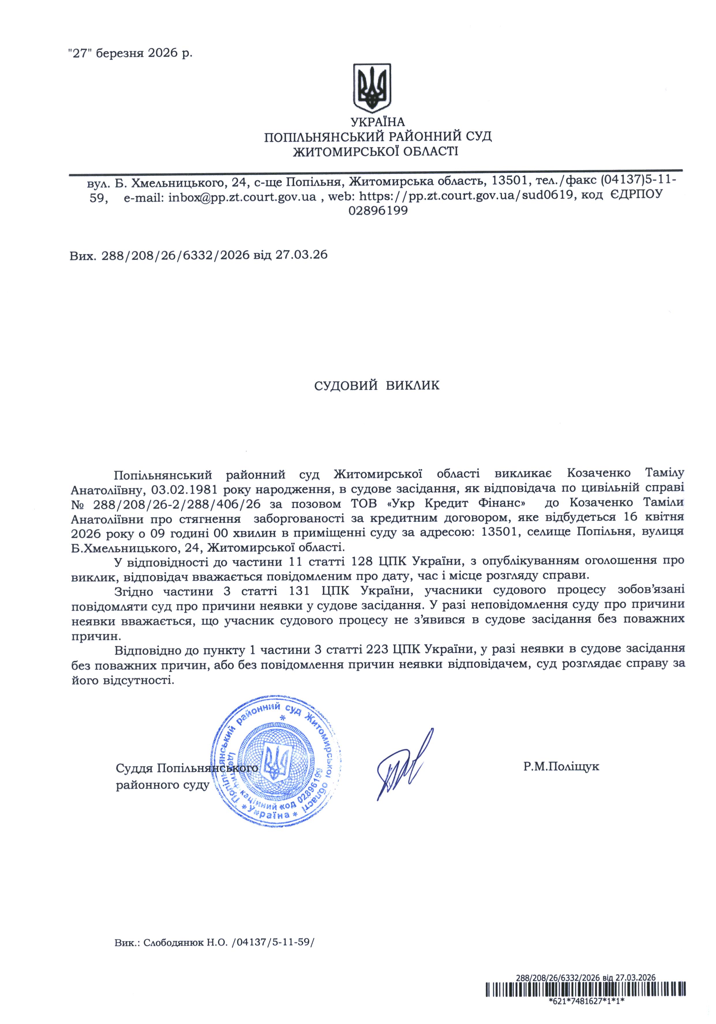 Оголошення про виклик до суду Козаченко Тамілу Анатоліївну