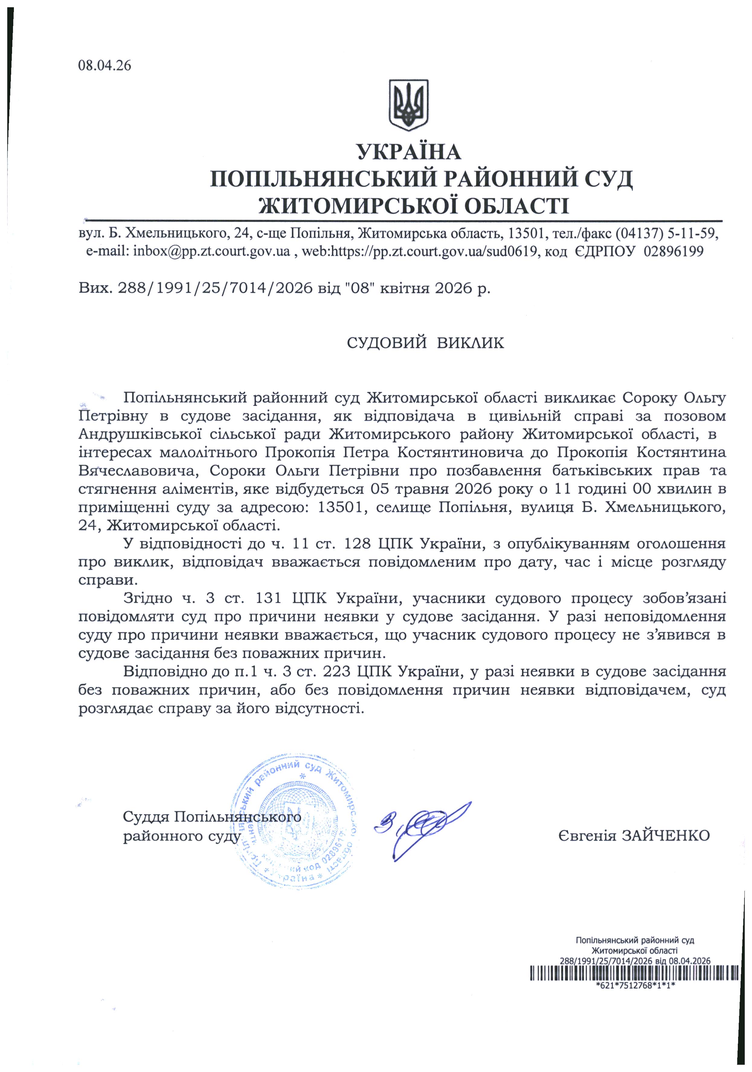 Оголошення про виклик до суду Сороку Ольгу Петрівну