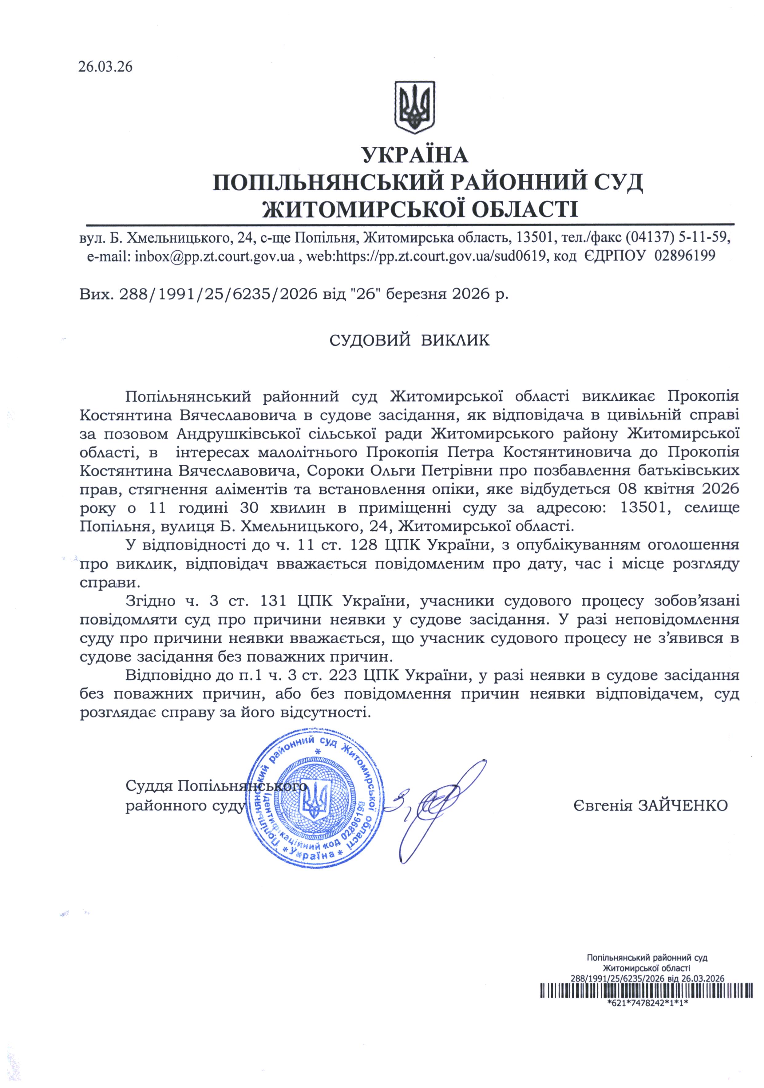 Оголошення про виклик до суду Прокопія Констянтина Вячеславовича