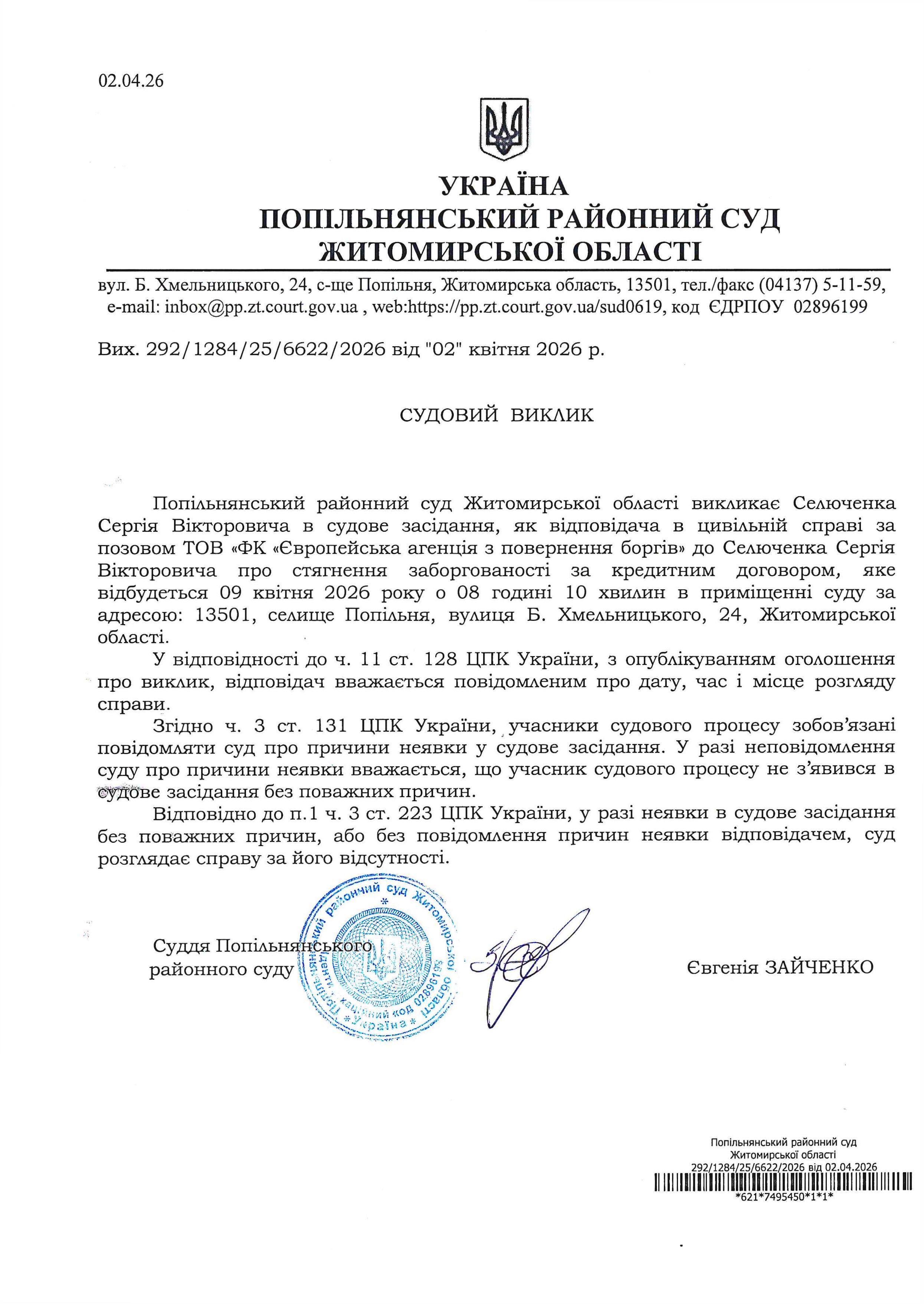 Оголошення про виклик до суду Селюченка Сергія Вікторовича