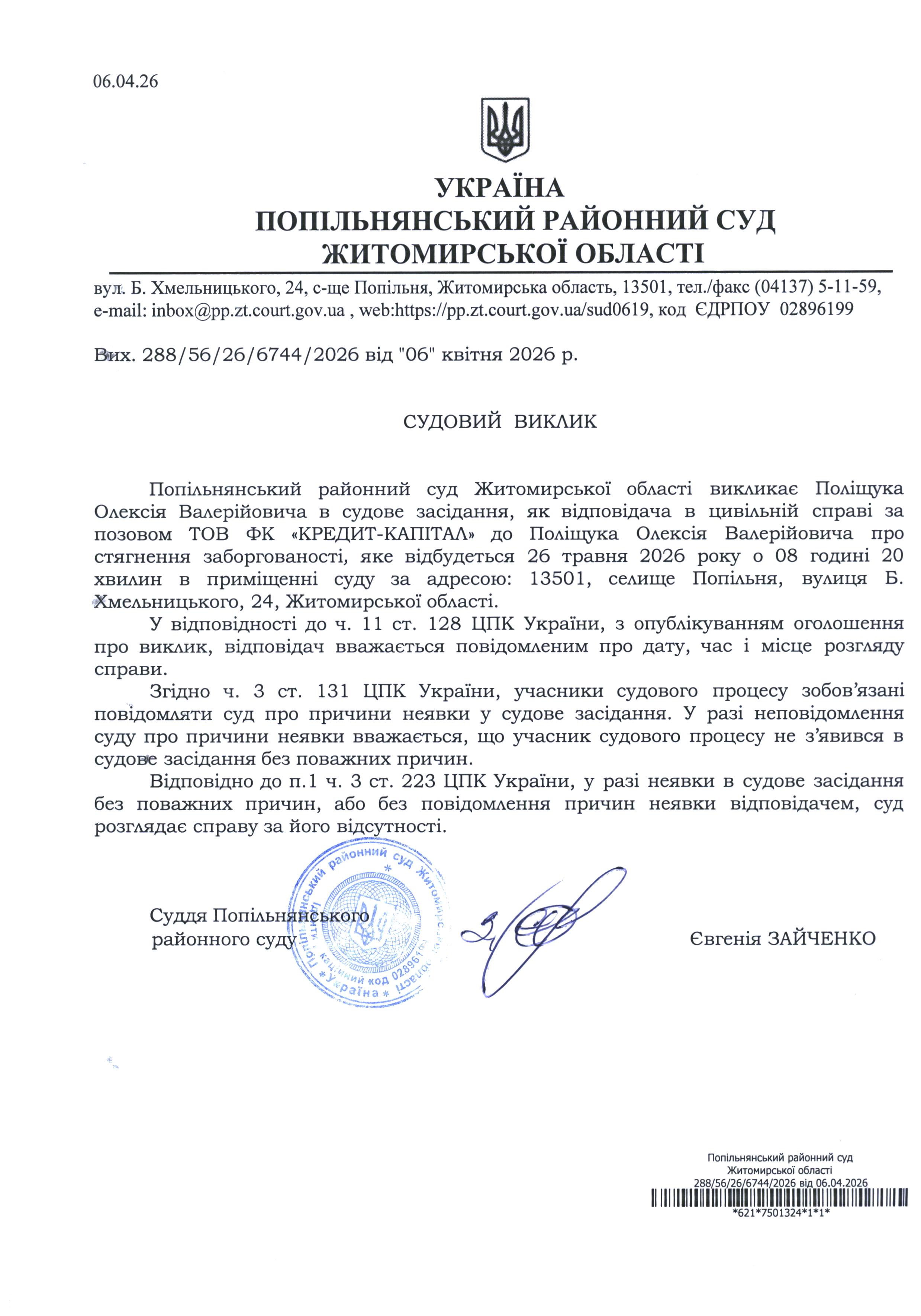 Оголошення про виклик до суду Поліщука Олексія Валерійовича