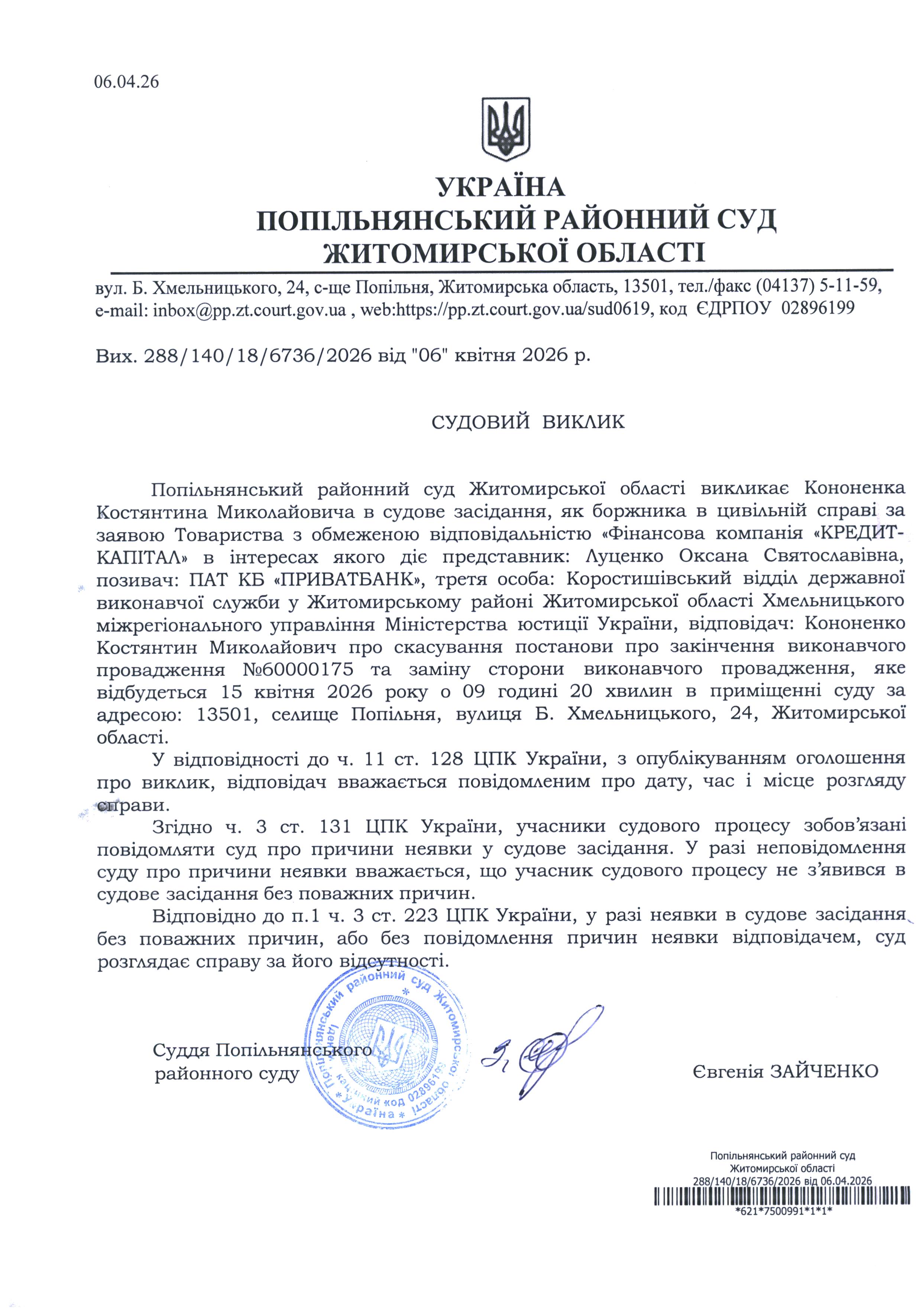 Оголошення про виклик до суду Кононенка Костянтина Миколайовича