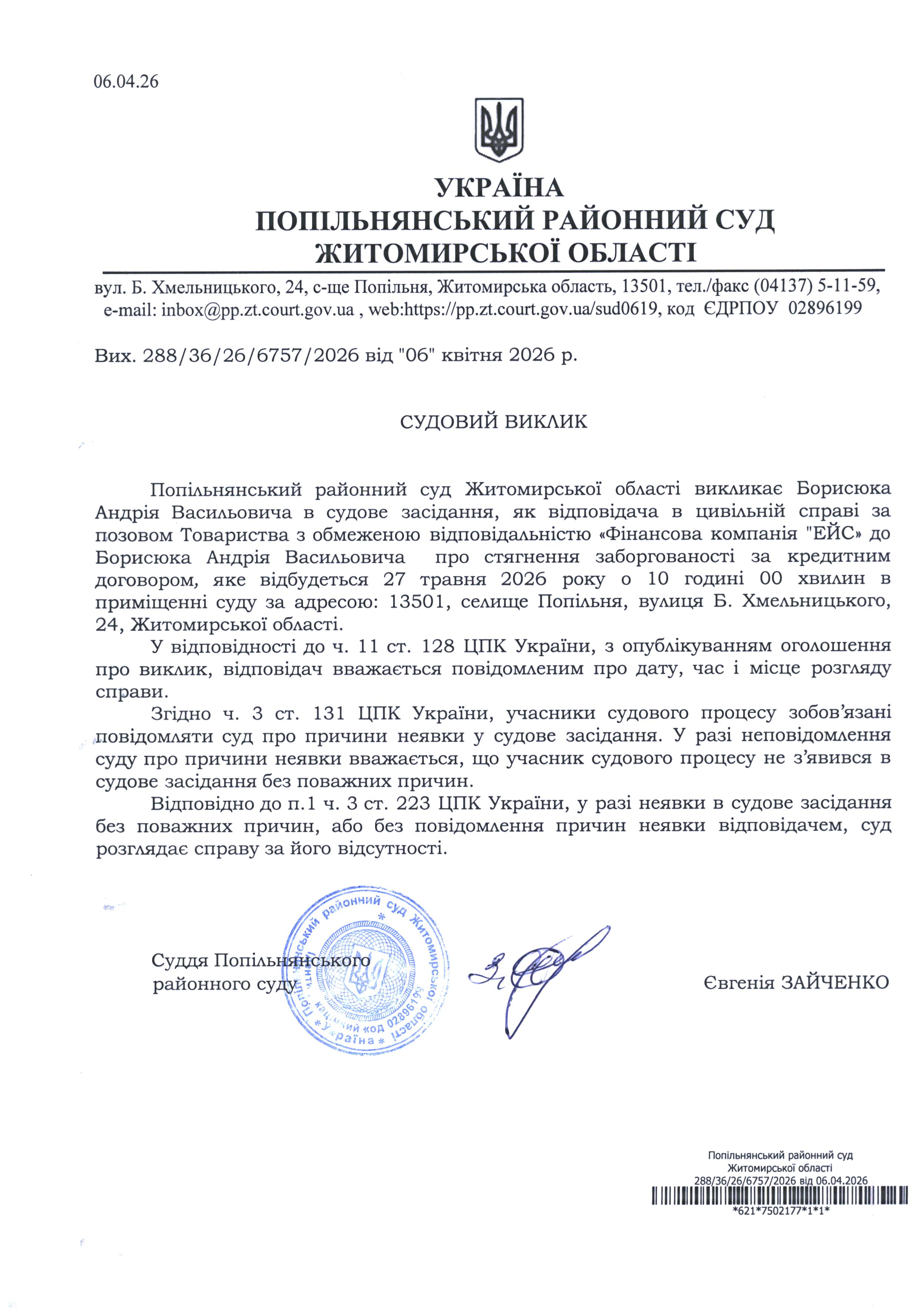 Оголошення про виклик до суду Борисюка Андрія Васильовича