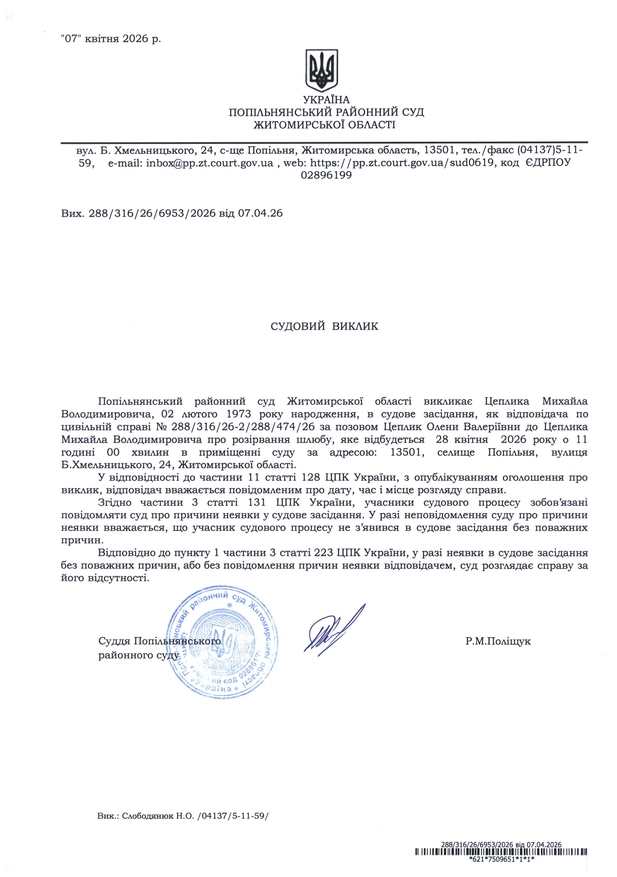 Оголошення про виклик до суду Цеплика Михайла Володимировича