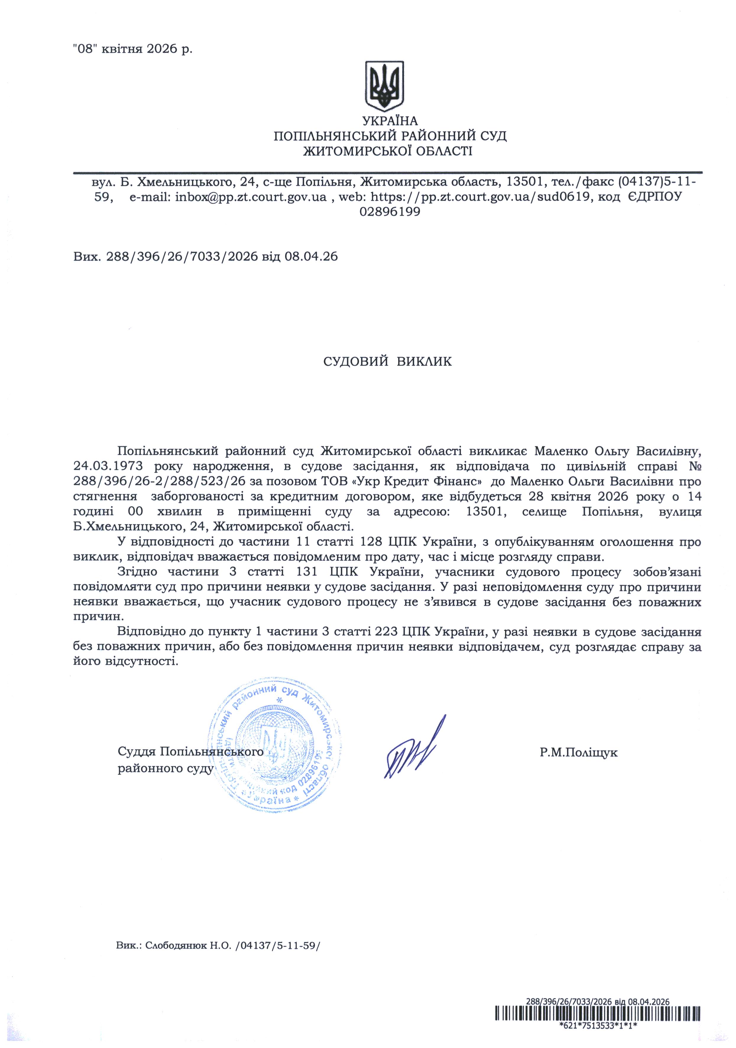 Оголошення про виклик до суду Маленко Ольгу Василівну