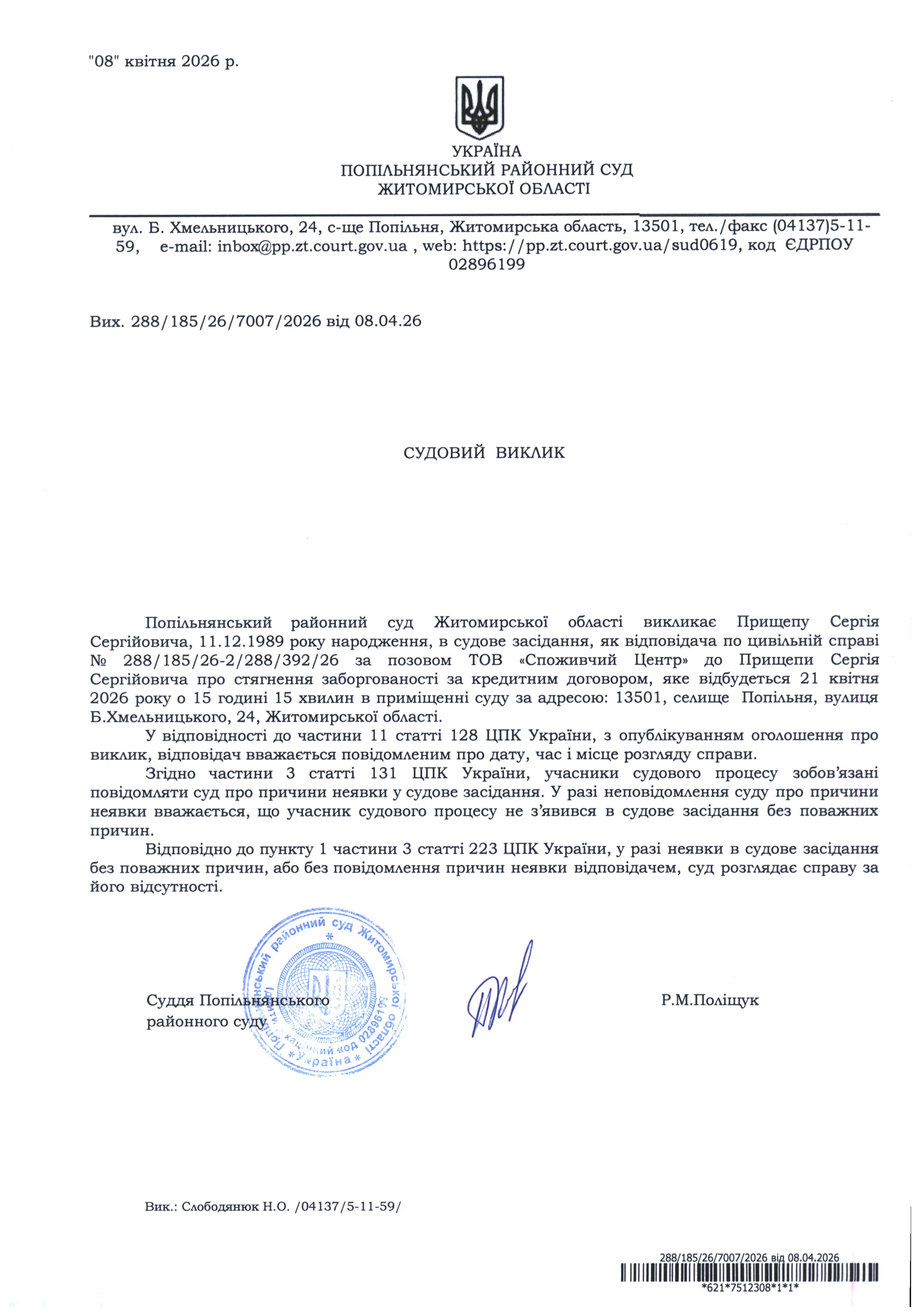 Оголошення про виклик до суду Прищепу Сергія Сергійовича