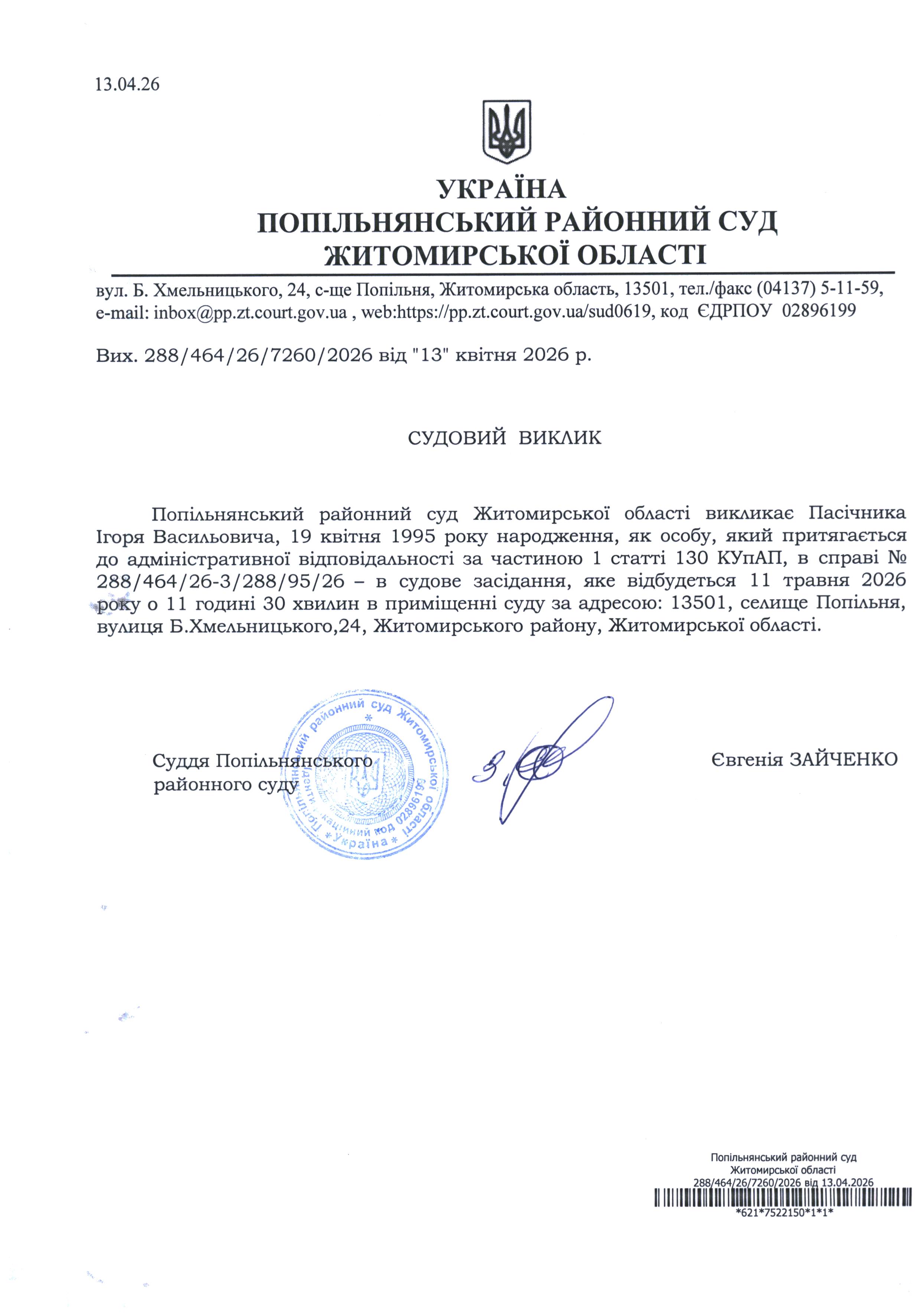 Оголошення про виклик до суду Пасічника Ігоря Васильовича