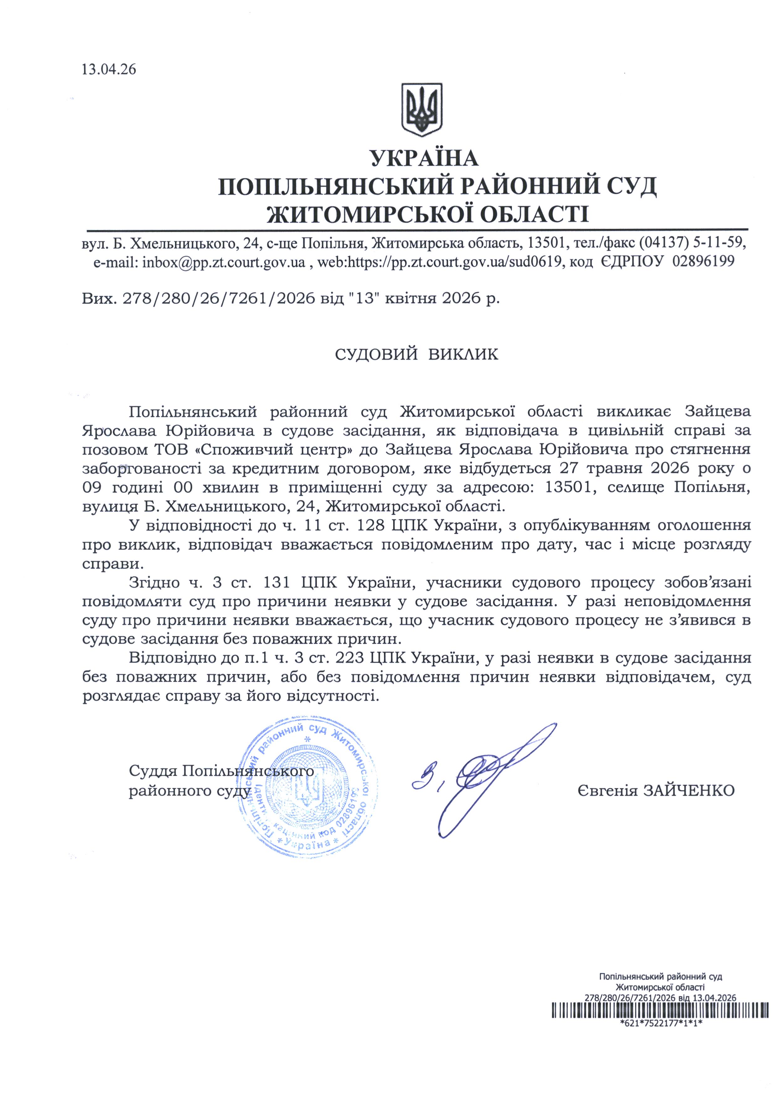 Оголошення про виклик до суду Зайцева Ярослава Юрійовича