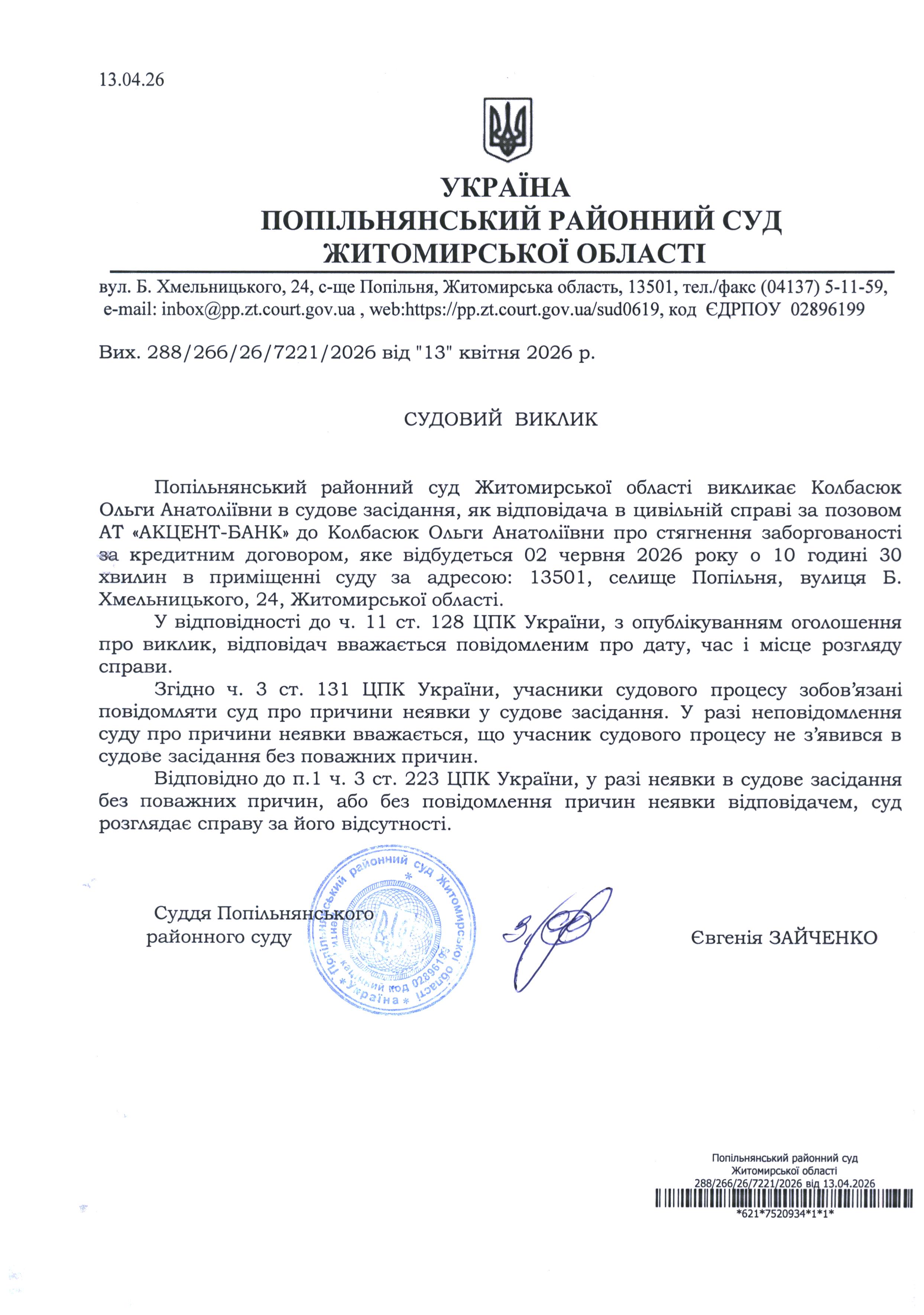 Оголошення про виклик до суду Колбасюк Ольгу Анатоліївну