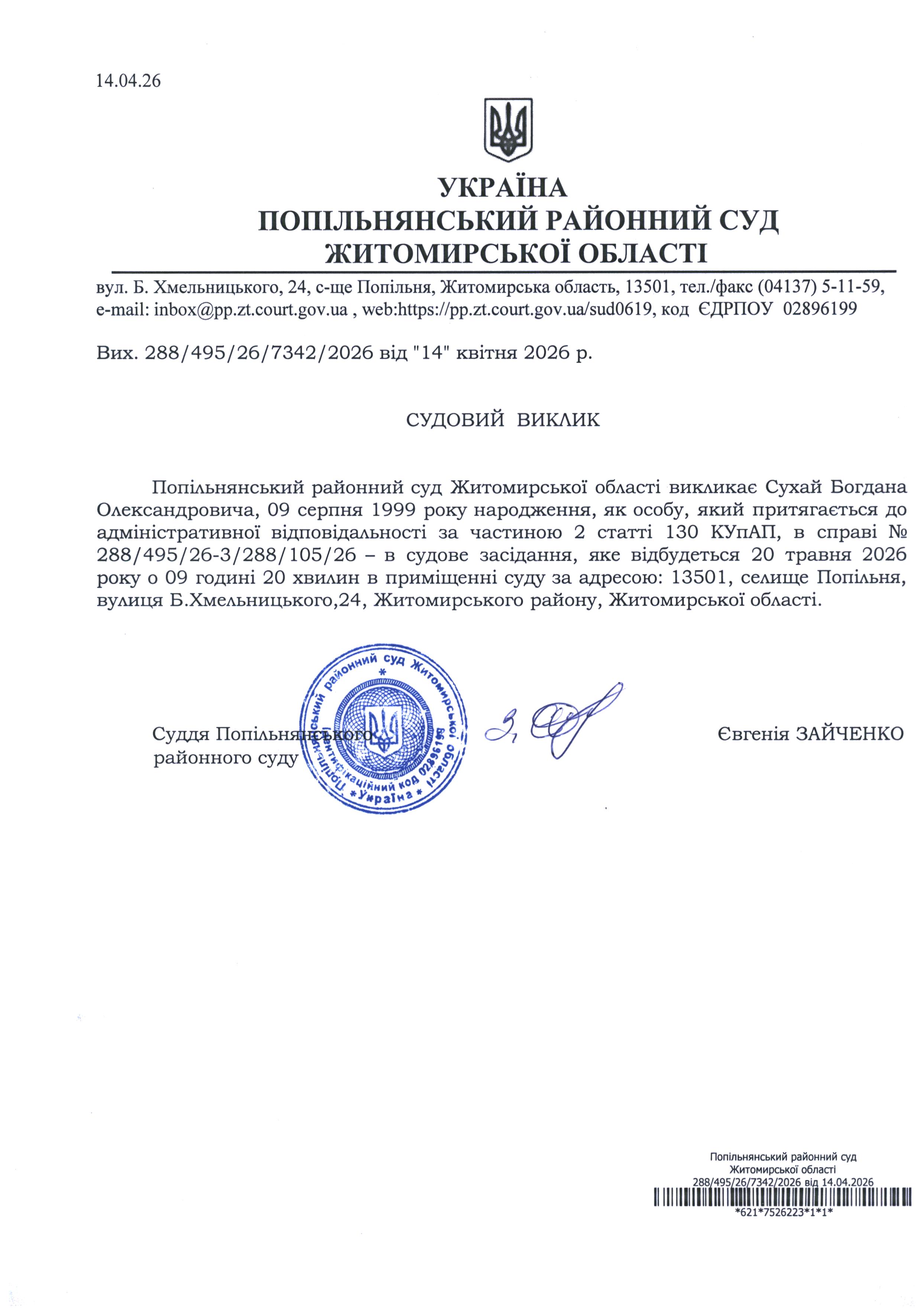 Оголошення про виклик до суду Сухай Богдана Олександровича