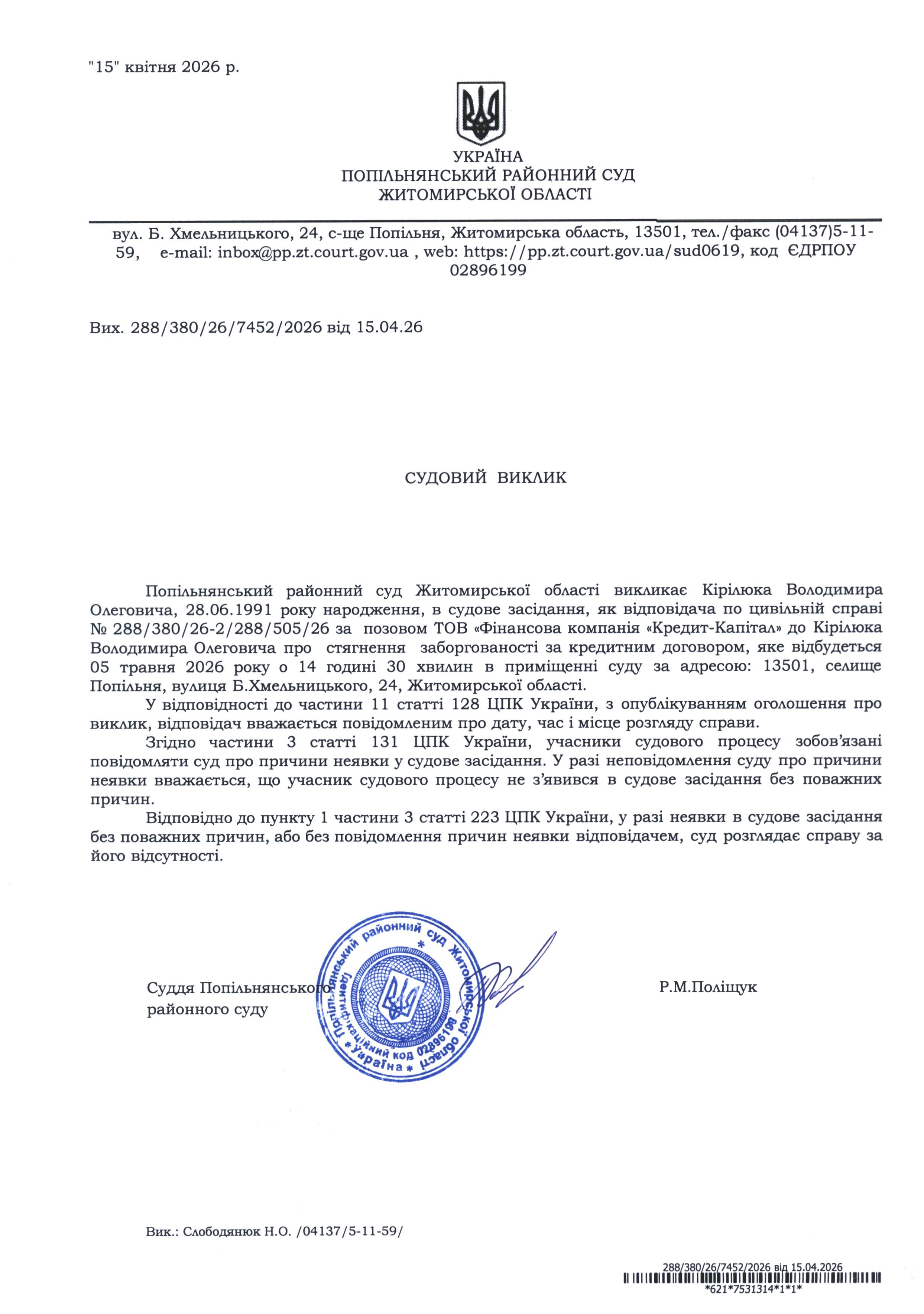 Оголошення про виклик до суду Кірілюка Володимира Олеговича